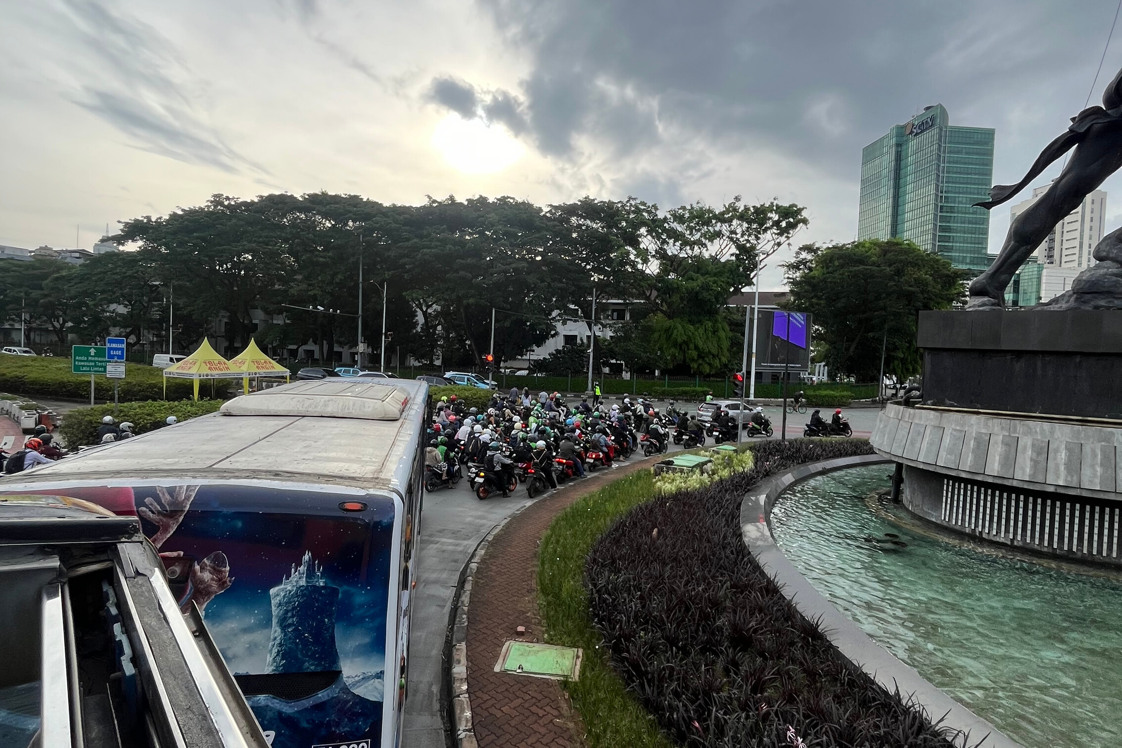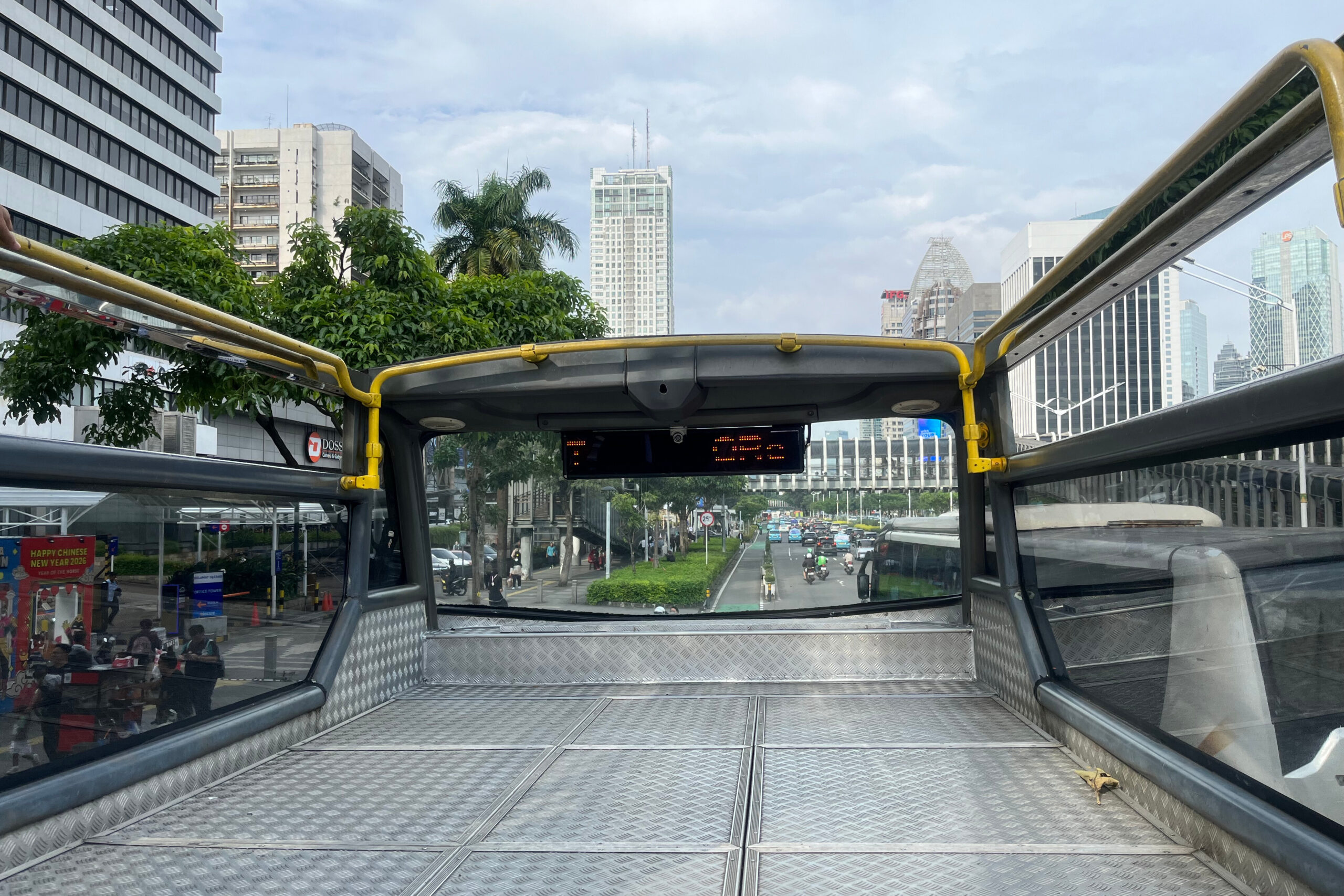 ジャカルタ市内中心地を巡るSkylineルートの見どころは、ジャカルタの都会的な街並みとバス乗り場付近の歩道橋や道路にギリギリのラインでバスのオープンデッキが通過するスリル感にあるようです。ナイトツアーに参加すれば、ビル群がライトアップされてより一層、都会っぽさを味わうことができます。