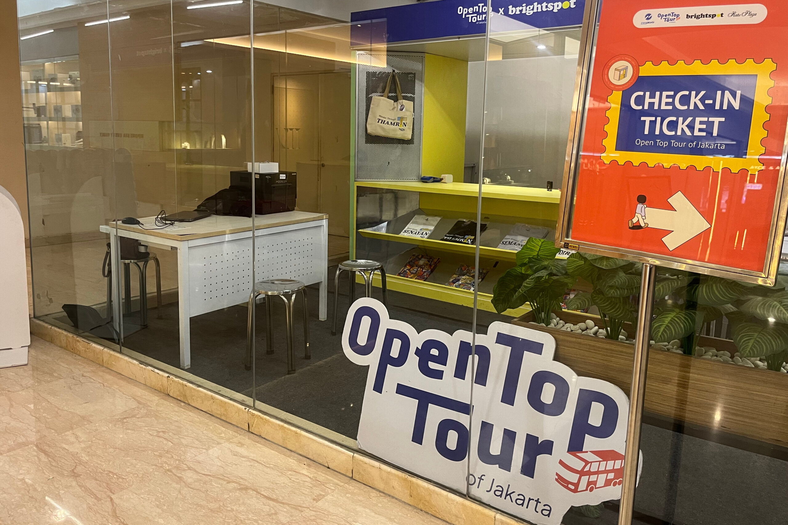 今回は、ジャカルタ中心地を巡るSkylineルートについてご紹介します。集合場所はRatu PlazaのⅠ階にある待合ラウンジです。事前に予約したチケットをスタッフに見せると腕に巻くチケットと交換してもらうことができ、ラウンジで時間まで待つことができます。ラウンジとはいうものの、簡易な椅子が置いてあるだけで待つためだけの場所という雰囲気です。