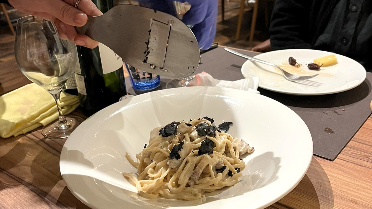 〆には『トリュフ香る』自家製ベーコンのクリームソース 生パスタのタリオリーニ。目の前でトリュフを削ってくれます。良い香りで大満足のパスタです。他にもたくさんお料理頂きましたが、どれも美味しくワイン好きの方におすすめです。またワインを覚えたいという方にも、ソムリエのオーナーが好みに合わせ、色々ご提案してくれるので気軽に訪れてみてくださいね