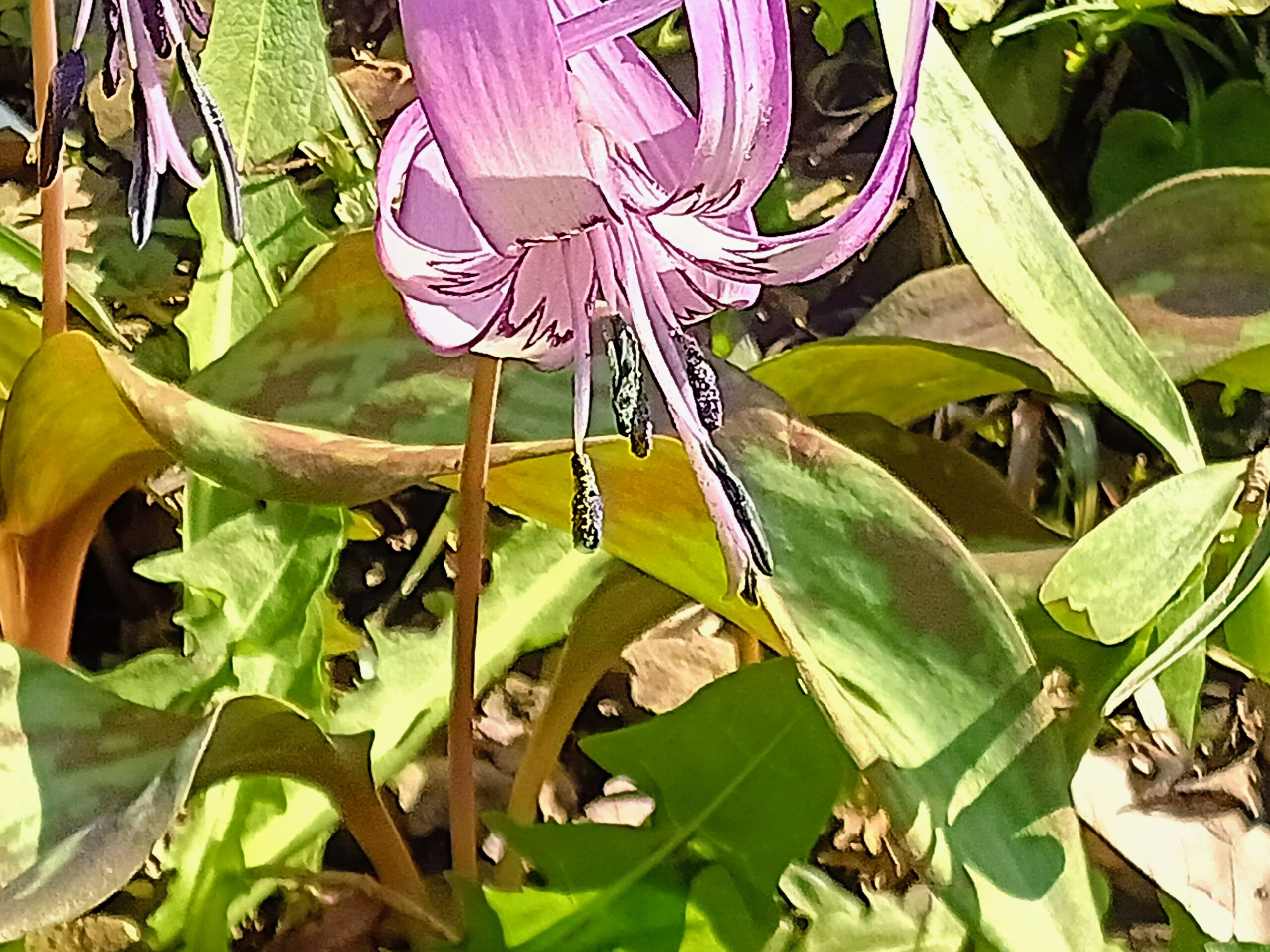 明るい場所に咲いているカタクリは花びらがクルンと外に向かってカールしていますが、少し陰になるとヒトデのように広がっています。更に陽があたらなくなると花びらを閉じてしまします。