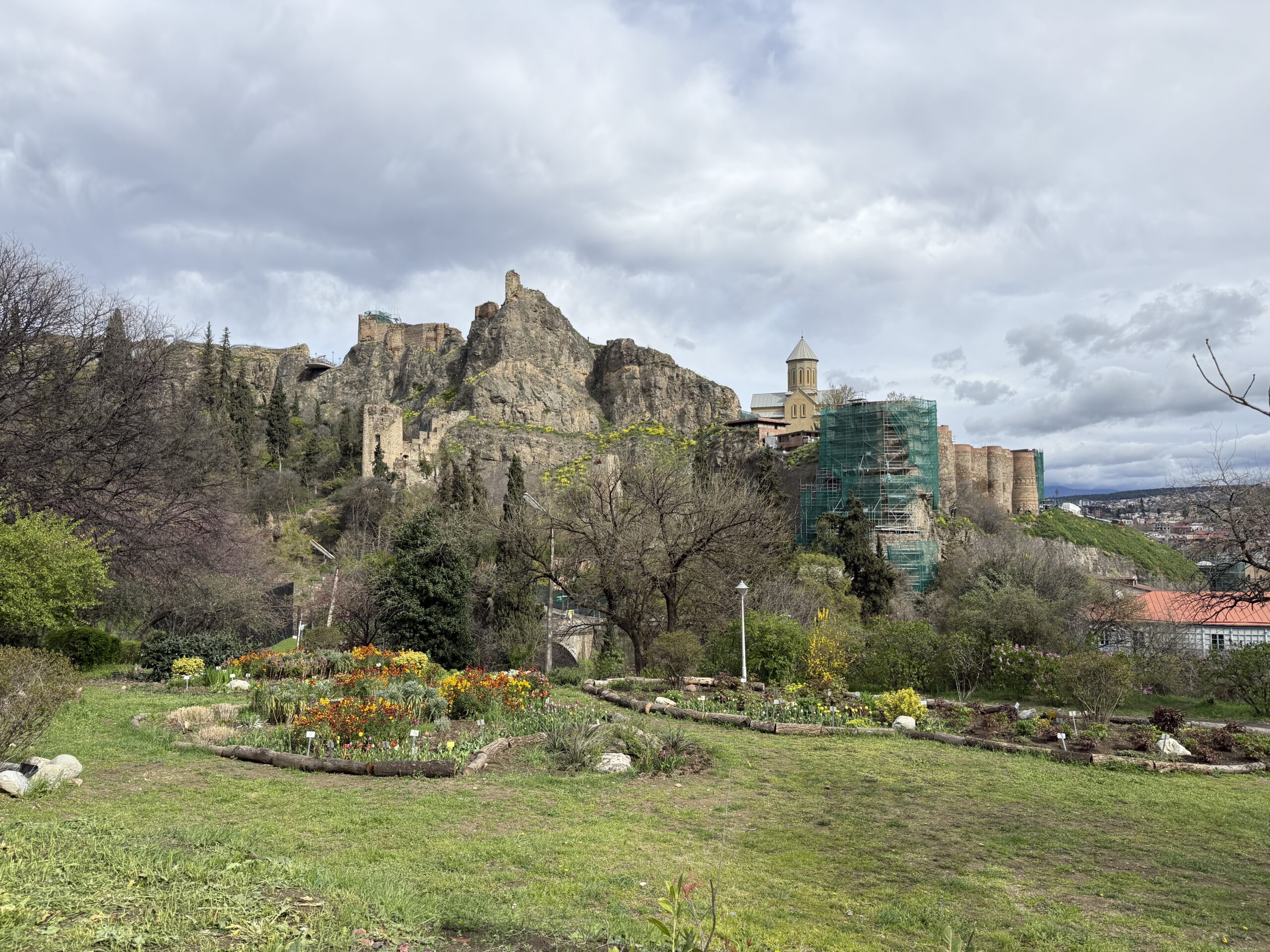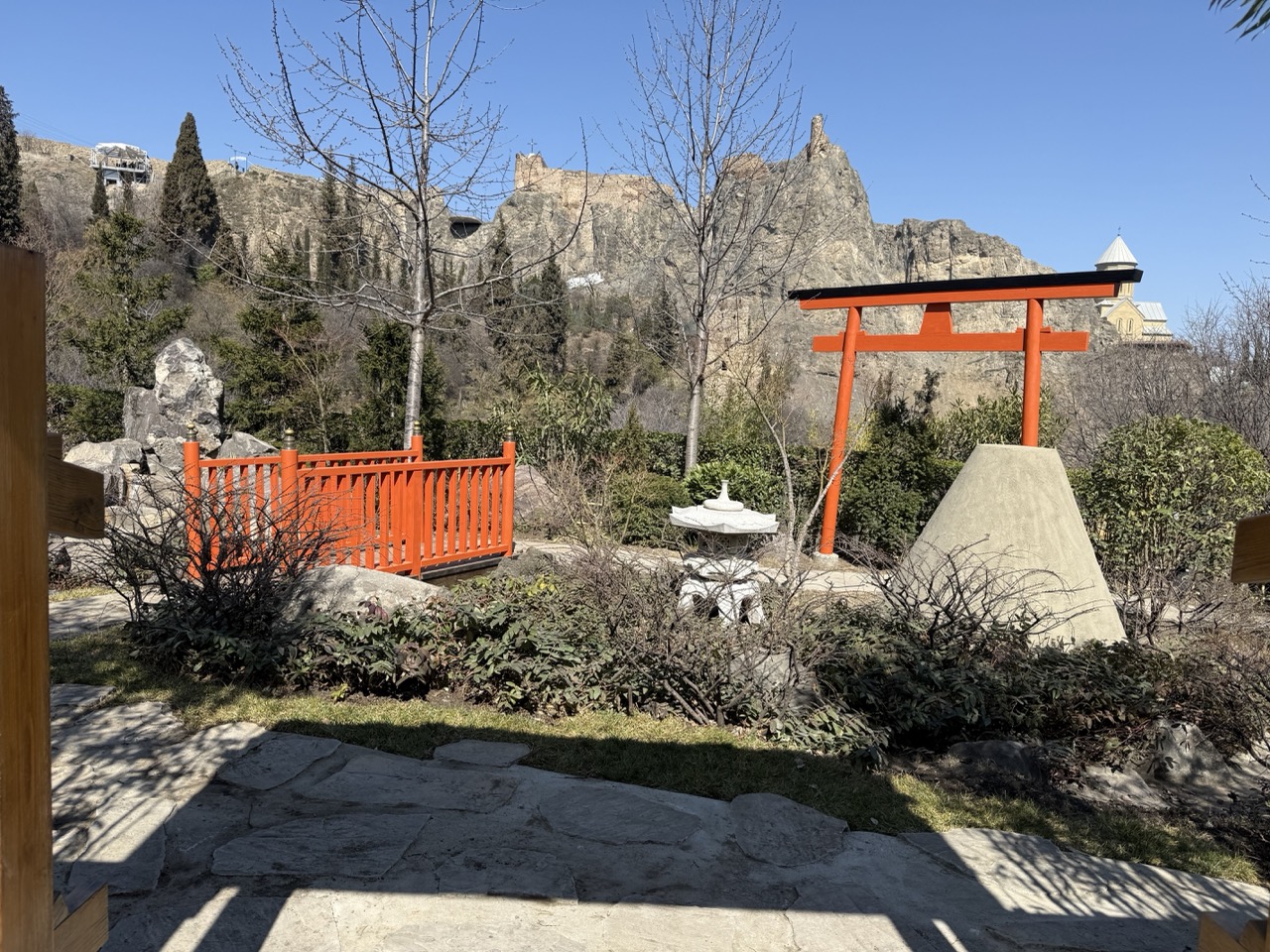 植物園らしく、各植物の解説パネルも充実していますが、魅力はそれだけではありません。園内にはヨーロッパ風のガーデンがあるほか、日本庭園のような落ち着いた空間も整備されています。一方で、自然の地形をそのまま活かしたダイナミックなエリアも広がっています。少し高い場所からは、トビリシの象徴的な建造物であるナリカラ要塞を裏側から見ることもできます。異なる角度からの眺望は、より一層の迫力を感じさせてくれます。