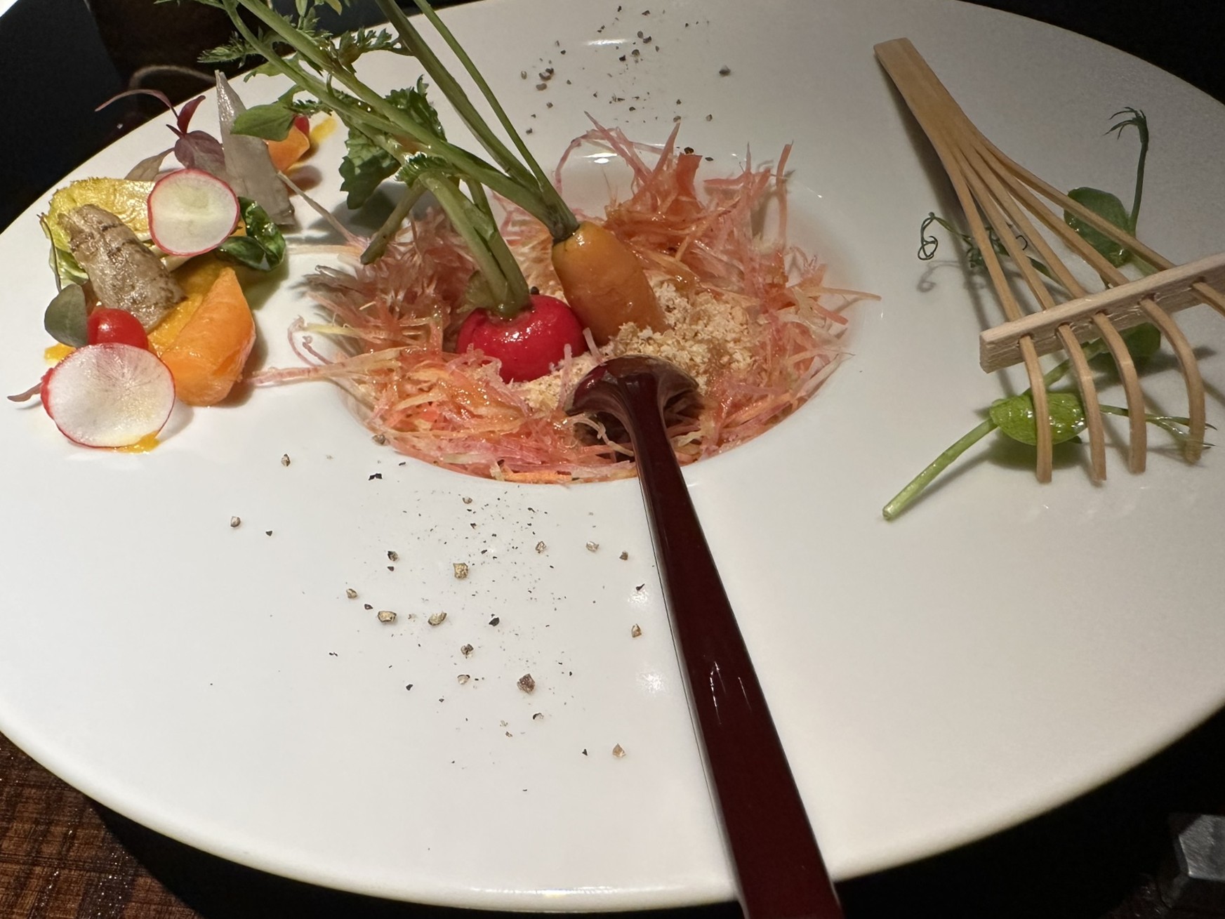 ・大地のサラダは、野菜を土から引き抜くような遊び心のある一皿。