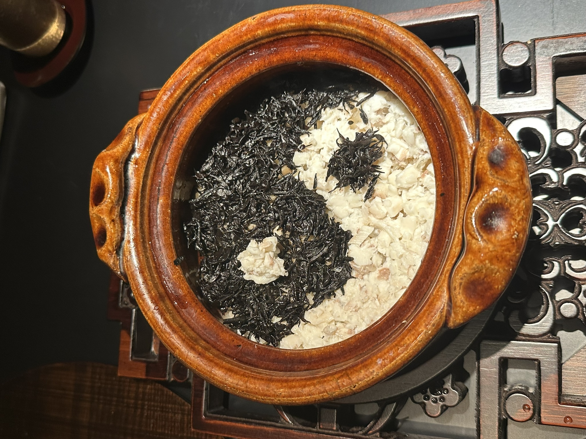 ・蓋を開けると、釜飯には太極図を思わせる白と黒の円が描かれています。