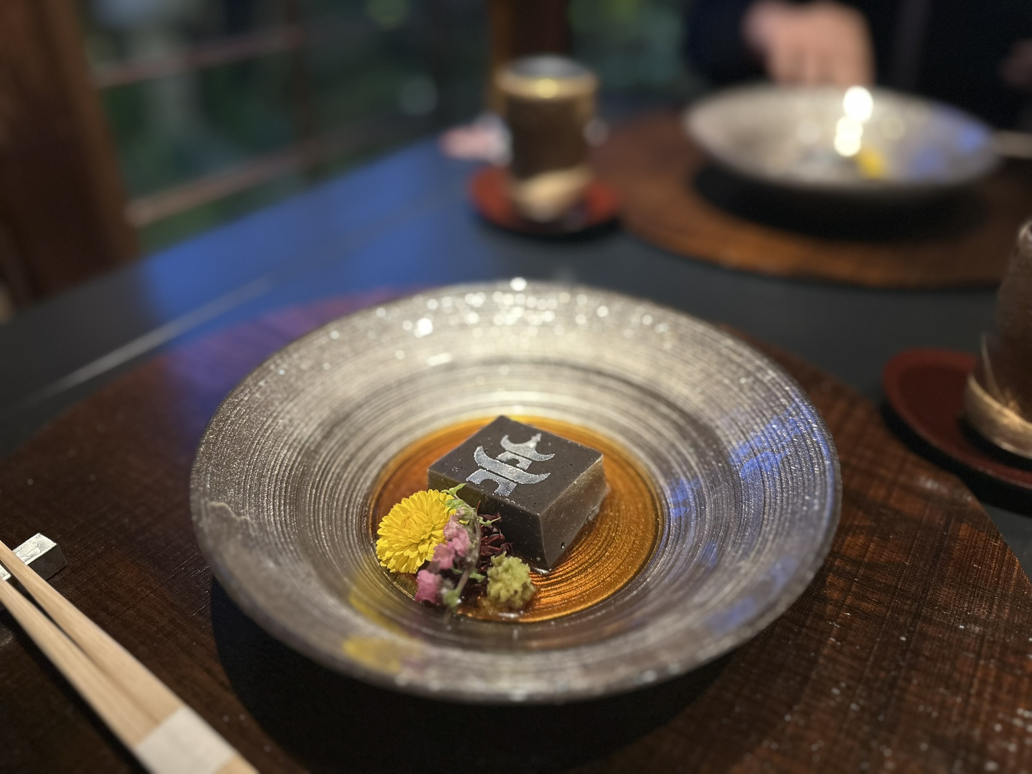 ・黒胡麻豆腐は、高野山の金堂を金粉で描いた一皿。
