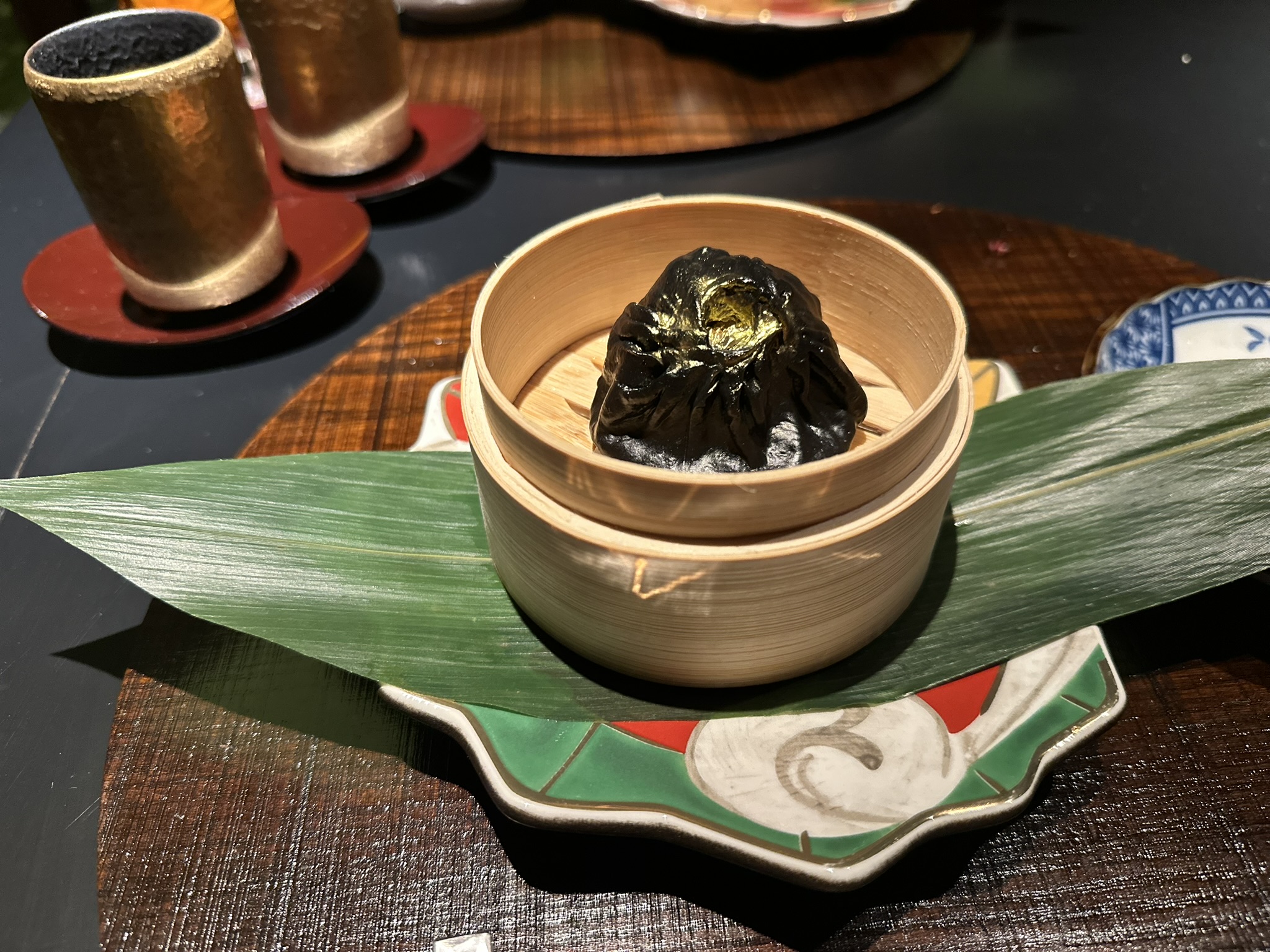 ・黒い小籠包はイカスミの皮で、中には近江牛の旨みが詰まった贅沢な味わい。