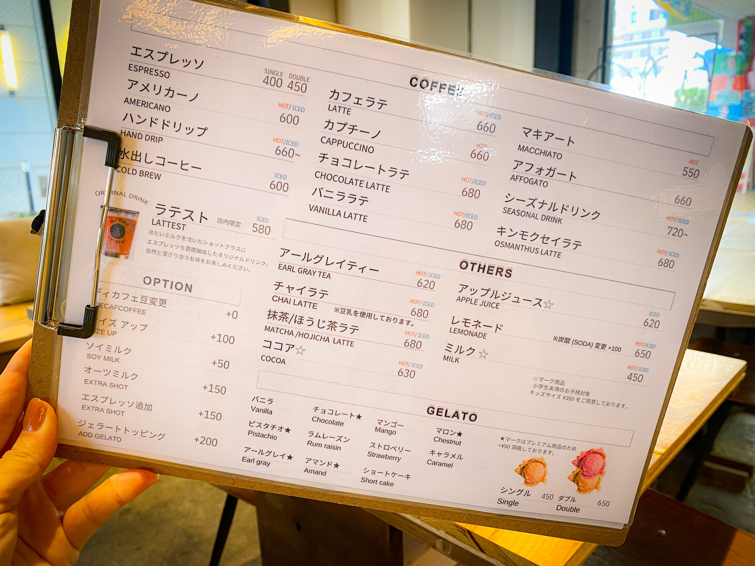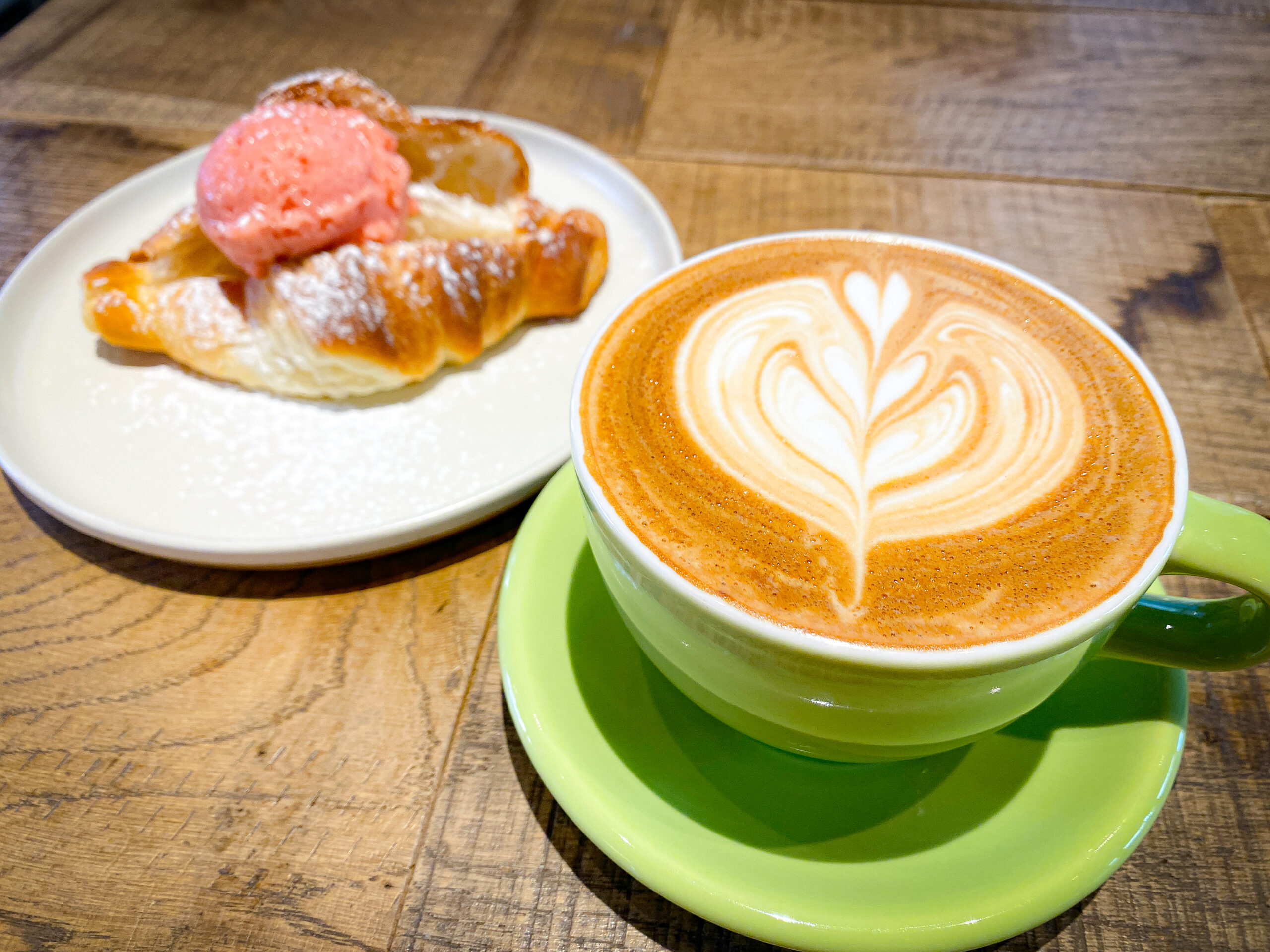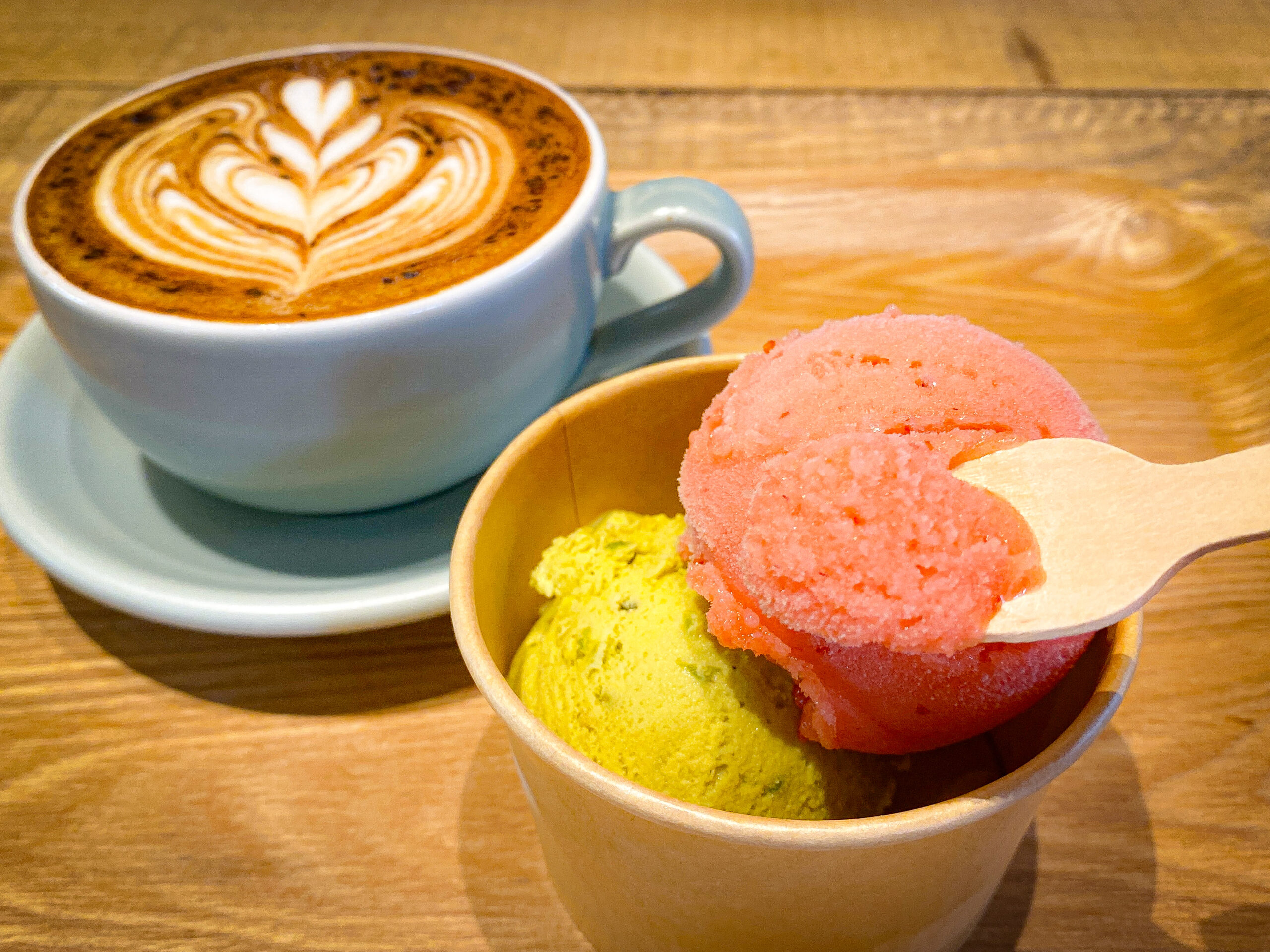 ジェラートはストロベリーとピスタチオをセレクト。彩りがきれいなだけなく、濃厚な味わいでラテとも相性抜群。ストロベリーは果肉感も楽しめます。