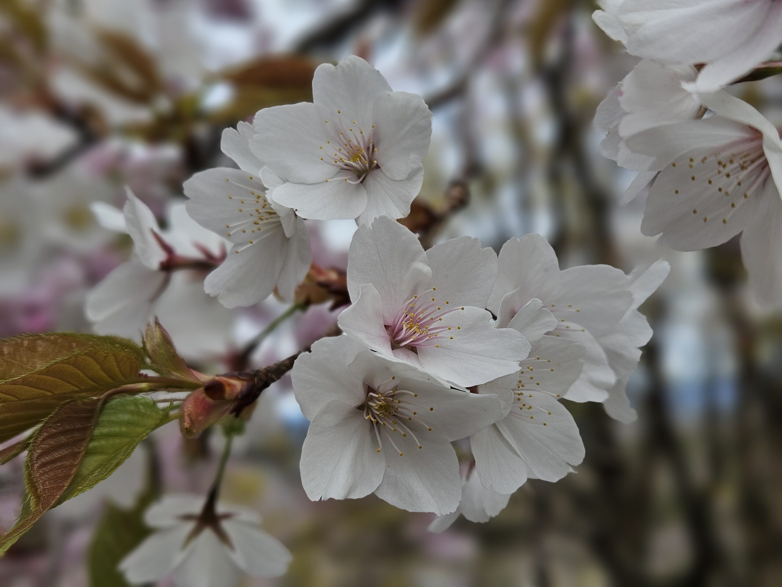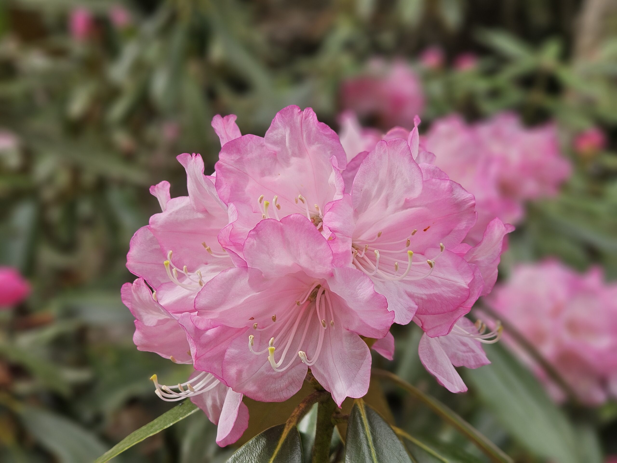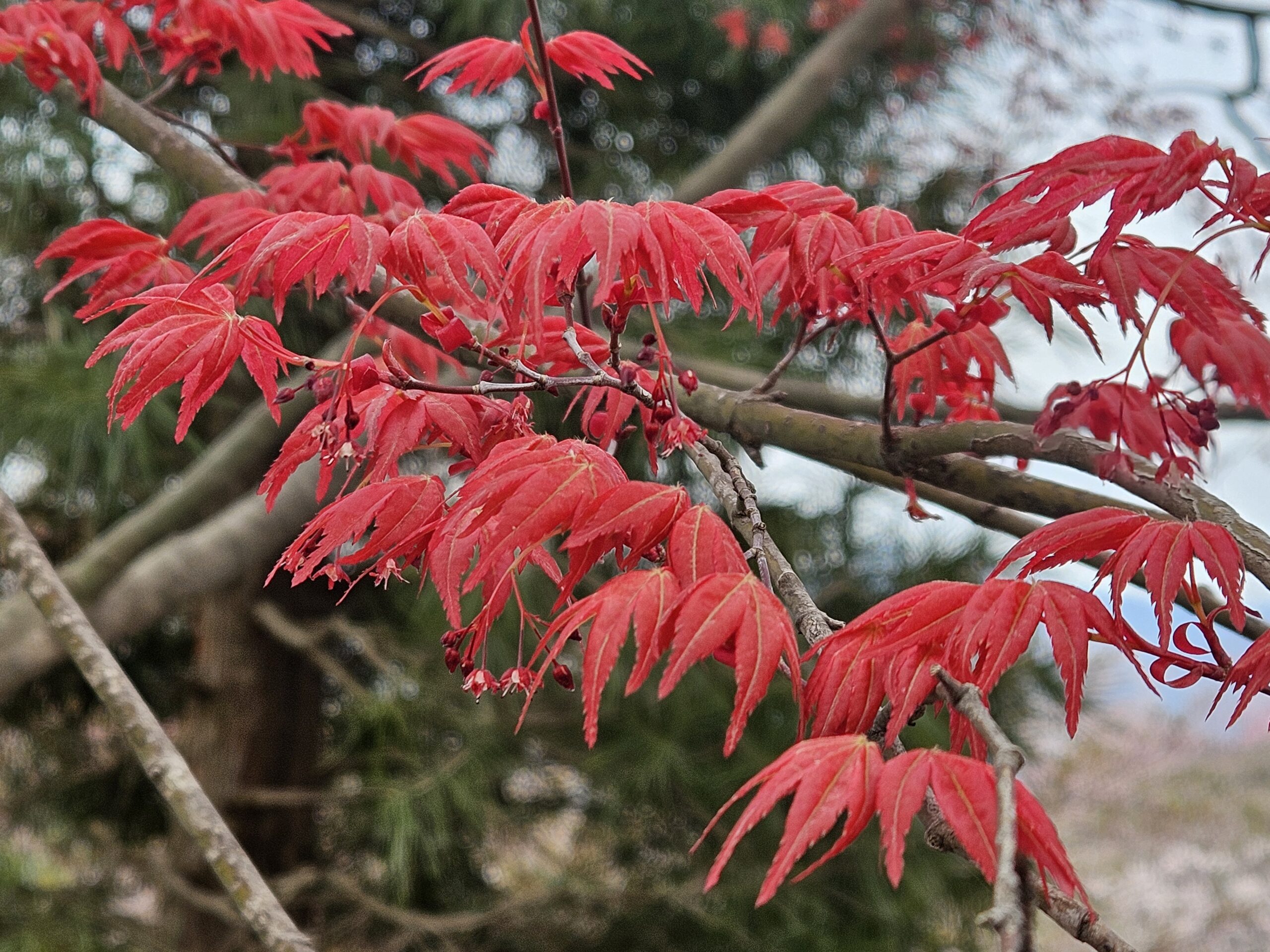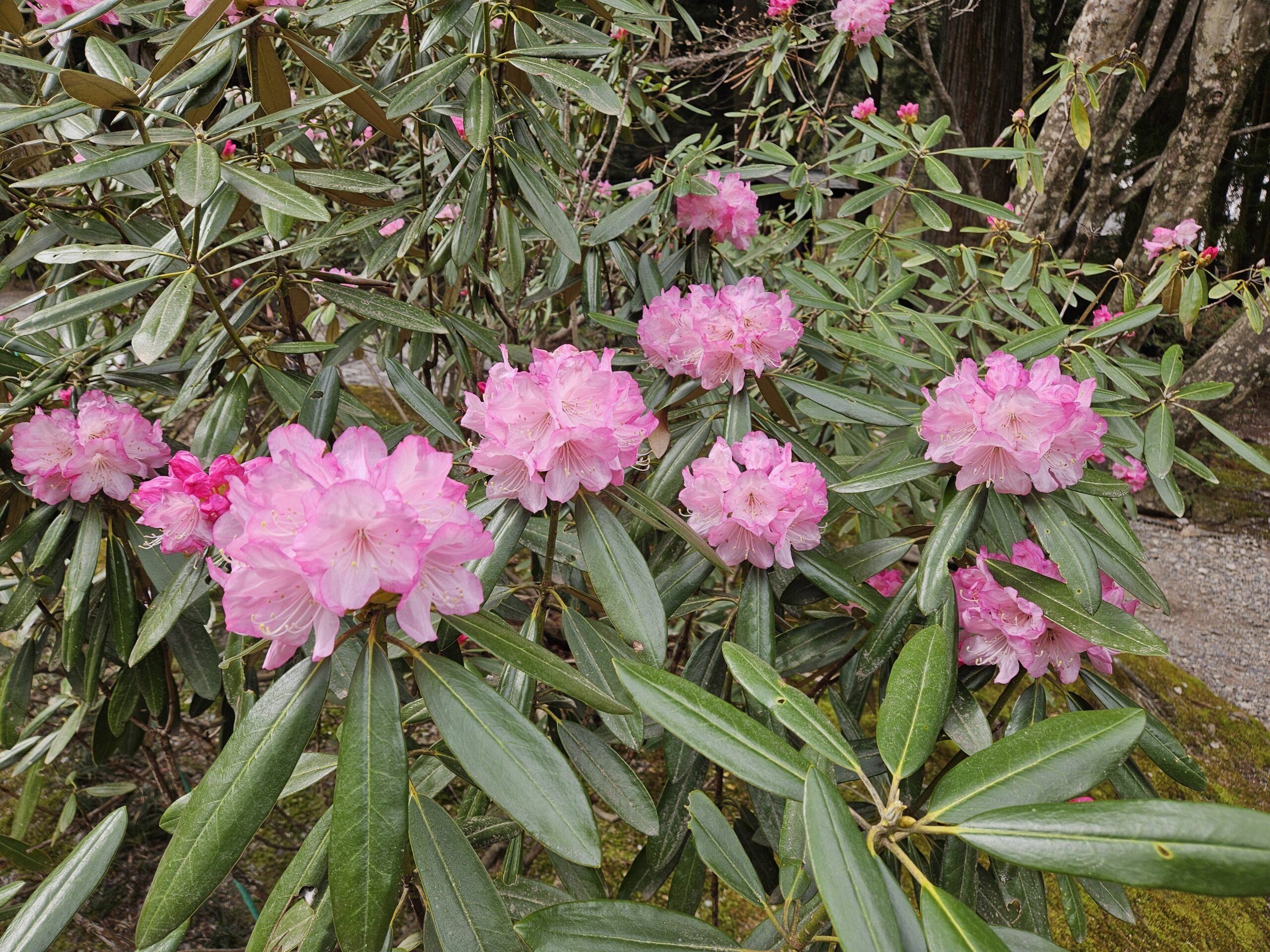 境内では桜のほかに、白、ピンク、赤のグラデーションが綺麗なシャクナゲ、薄黄緑色が特徴的なヒカゲツツジ、赤色が鮮やかなイロハモミジが見られます。桜の間に咲く黄色いレンギョウも華やかに境内を彩っていました。