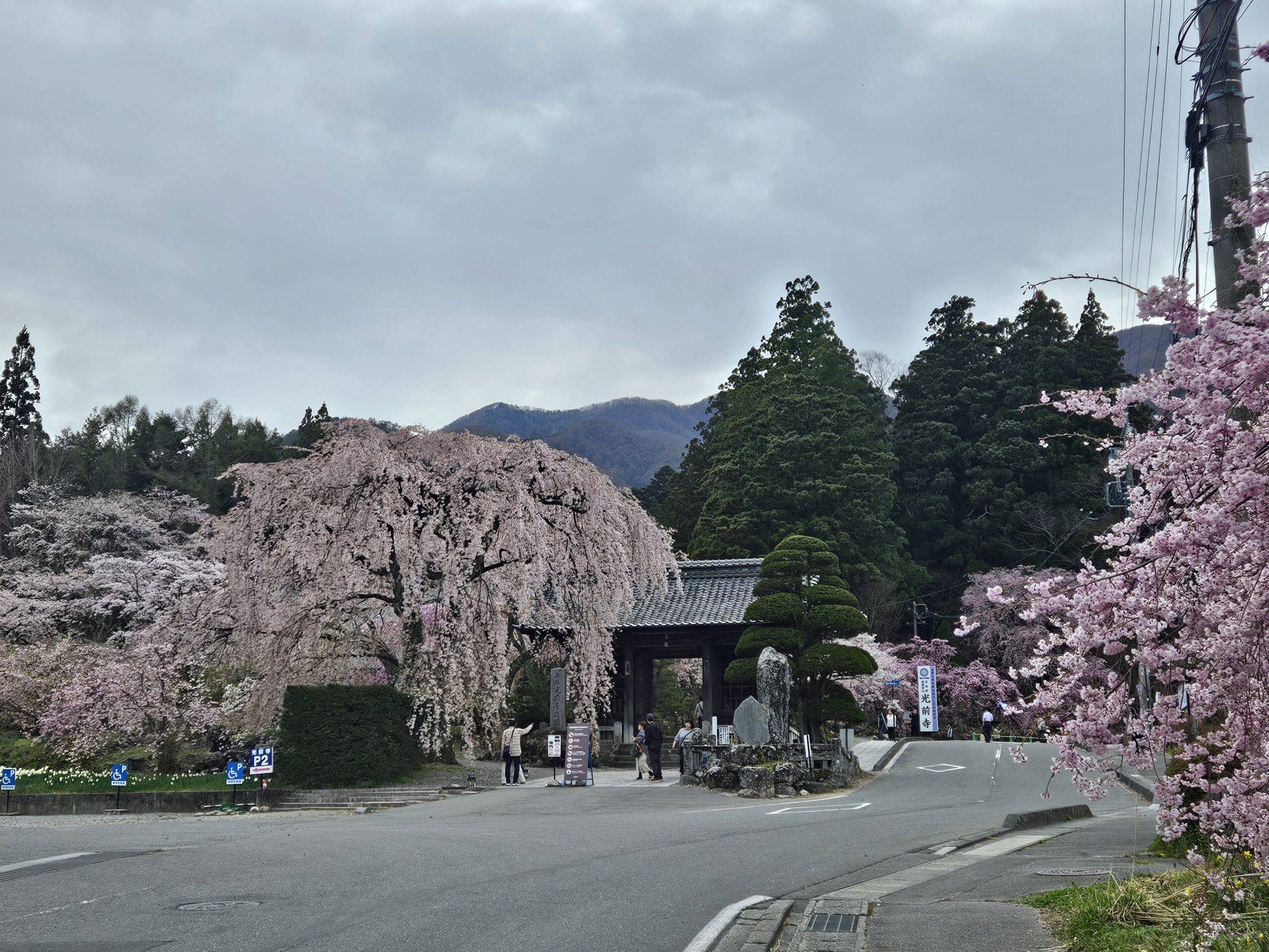 光善寺までの参道にはスイセンが植えられ、春らしい景色が広がっています。光前寺入口のしだれ桜は葉桜になり始めでしたが、第1駐車場近くにある樹齢約200年のしだれ桜は満開。平日にも関わらず観光バスが2、3台入れ替わりながらひっきりなしに訪れ、海外の方とも数名すれ違いました。