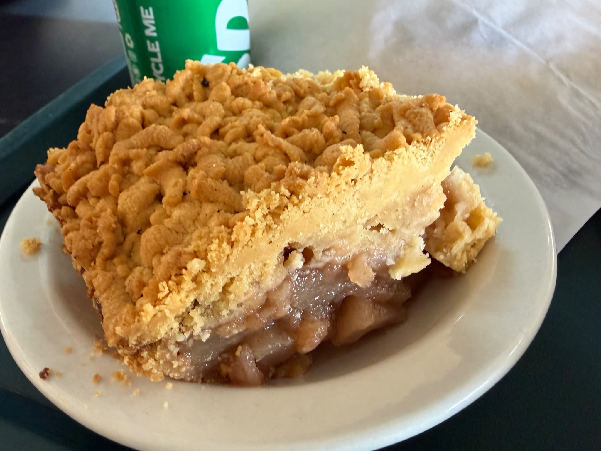 アップルパイはかなりのボリュームで、大人2人でシェアしてちょうどいいサイズです。パイというよりは「アップル・クランブル」に近く、ビスケット生地がベースです。見た目は“外国サイズ”の迫力ですが、味わいは意外にも日本人好みの素朴さです。ビスケットも中のアップルも甘さ控えめで、ほっこりする味わいでした