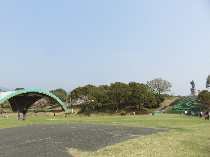 「あんずの丘」にある「ふれあい広場」では人工芝すべり台をすべる子供たちの元気いっぱいの声が聞こえて賑やか。人工芝すべり台にそびえ立つ銅像は何者だらぁか?! 出かけるとき気になったのでググりましたら隈部親永(くまべちかなが)16世紀後半、肥後北部の山鹿・菊池地方を治めた国人(国衆)で、1587年に勃発した肥後国衆一揆の中心人物だそうです。