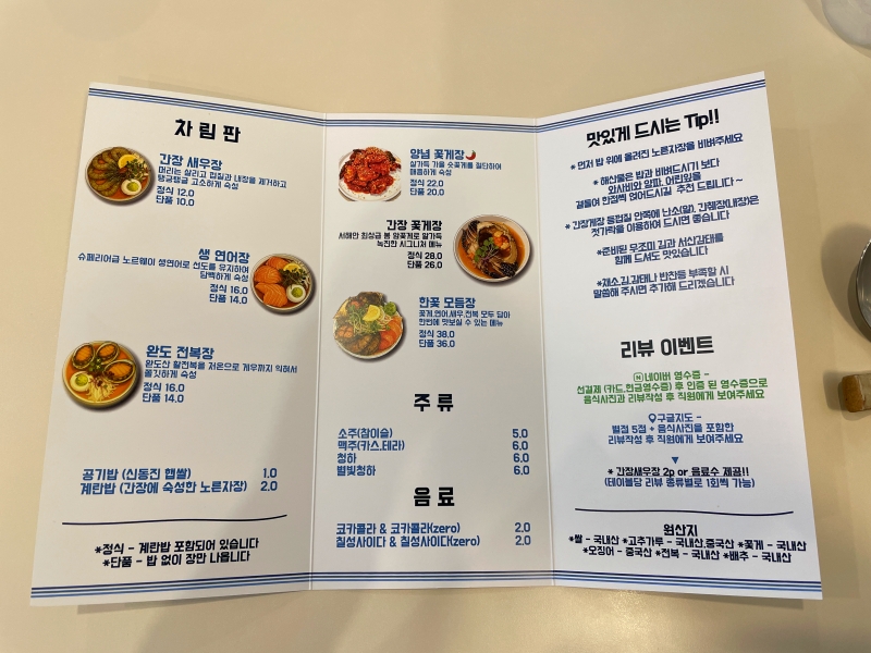 紙のメニューがありますが、QRコードで注文するスタイルです。日本語で確認できるので、安心ですね。看板メニューはカンジャンコッケジャン(醤油漬けワタリガニ・간장꽃게장)定食(28000ウォン)で、海老の醤油漬け、カンジャンセウジャン定食(12000ウォン)も人気です。いろいろ食べてみたい方は単品で注文してもいいかもしれません。