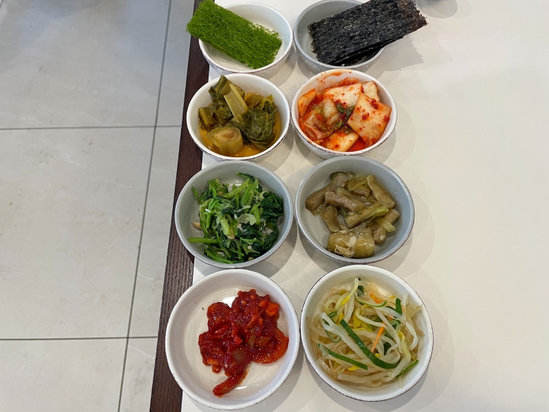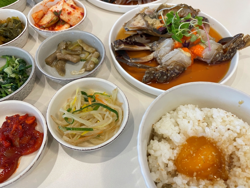 楽しみにしていたカンジャンコッケジャン定食が出てきました。様々な旬の野菜を利用したおかず(パンチャン)がどれも自然な味付けでおいしかったです。海苔はご飯を包んで食べます。