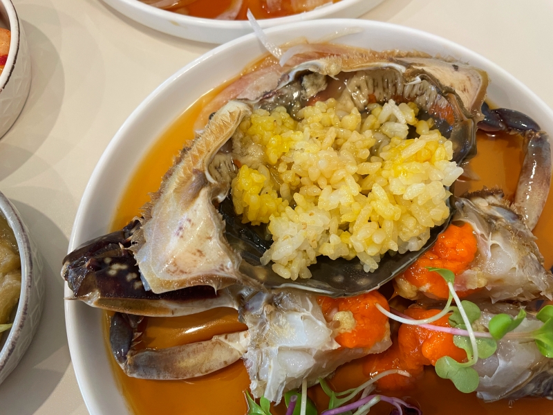 まず、ご飯にのっている黄身を混ぜて、甲羅に入れて混ぜて食べるのがおすすめです。韓国ではご飯泥棒と言うほどのおいしさです。