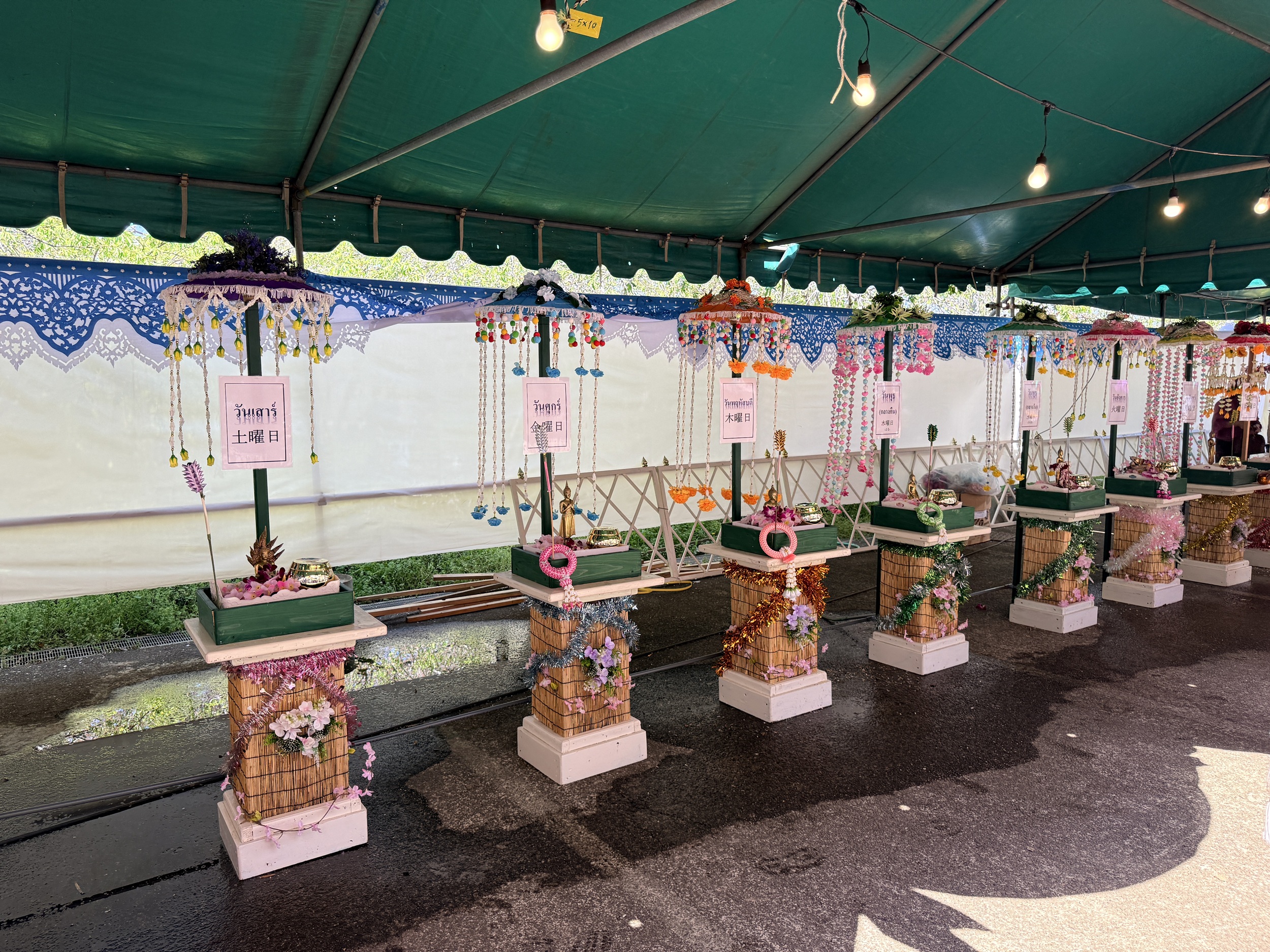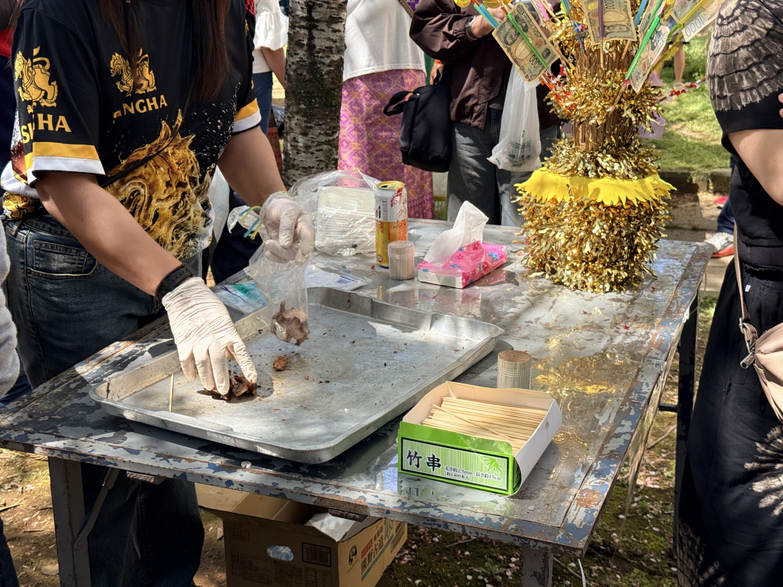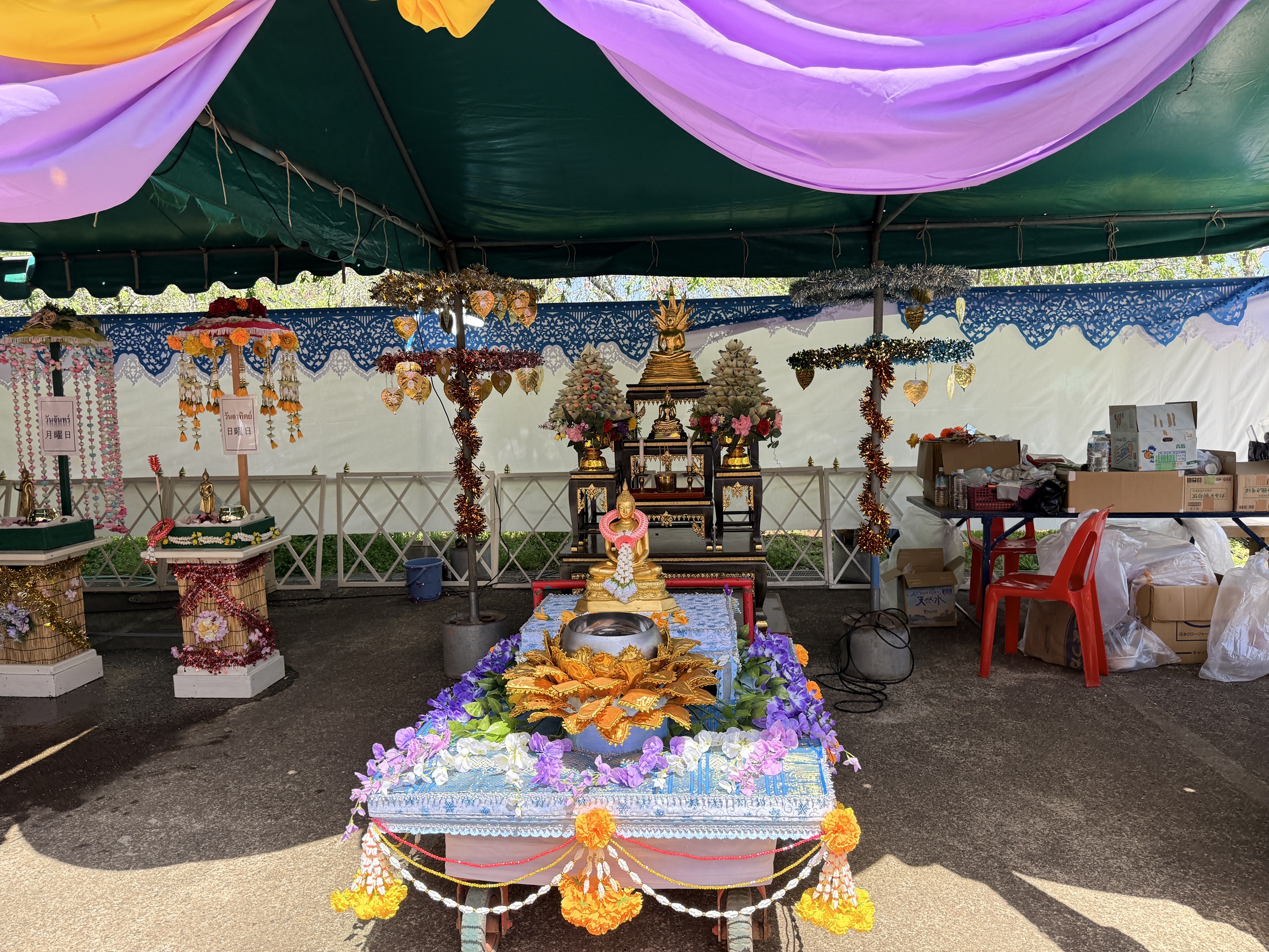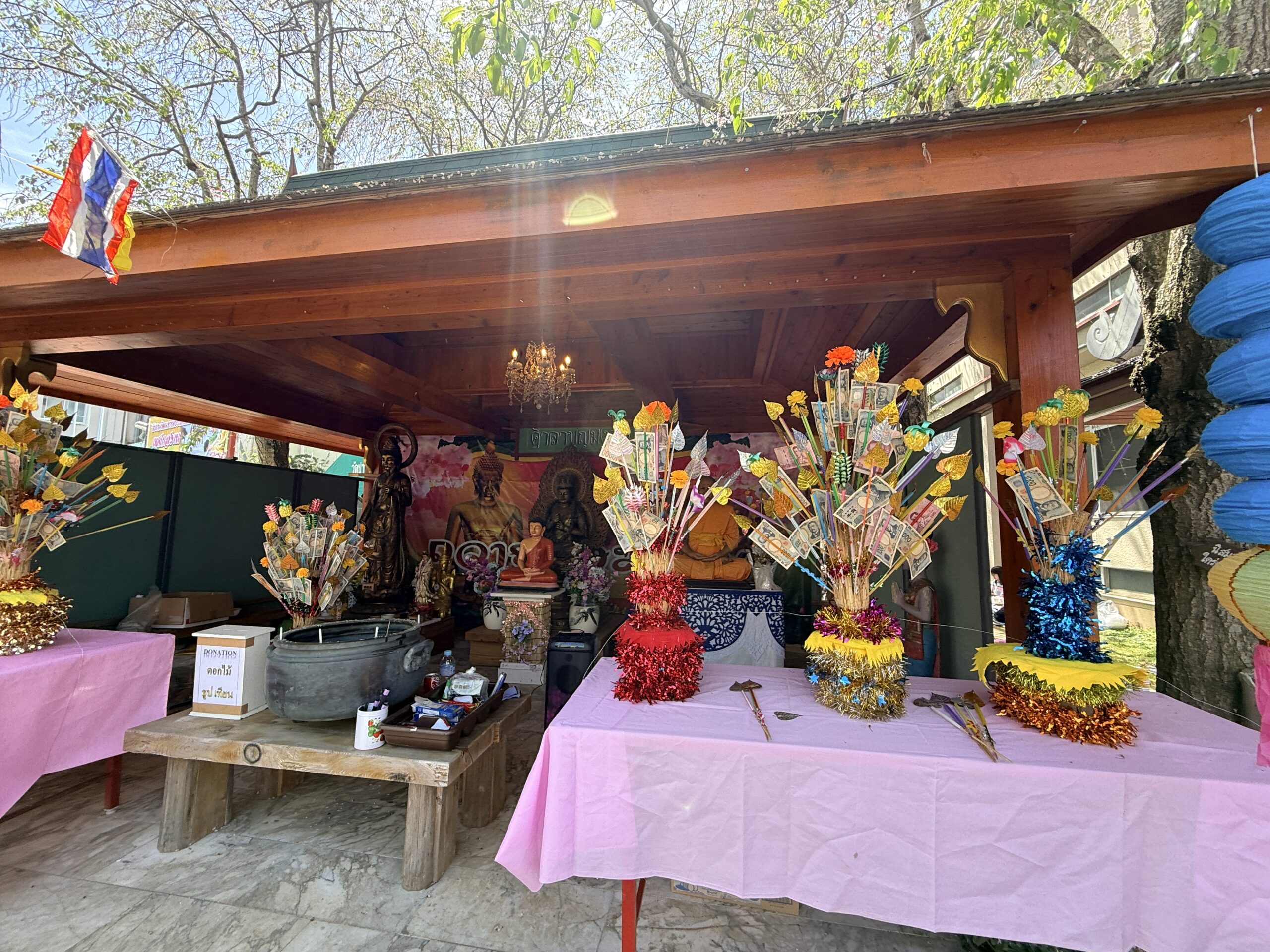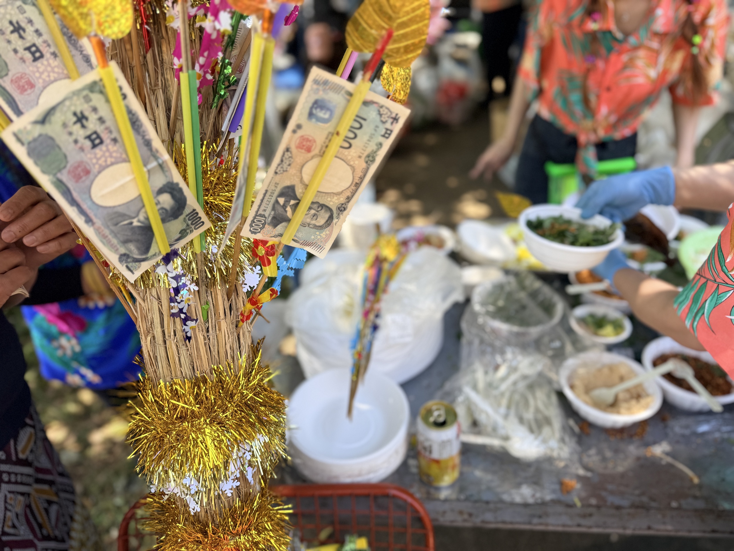 寺院へのタンブンのため、会場のあちこちには竹串にお札を挟んで土台に刺した「トーン・パーパー(お布施の木)」と呼ばれる色鮮やかな飾りが立てられ、お寺への寄付も絶え間なく行われていました。