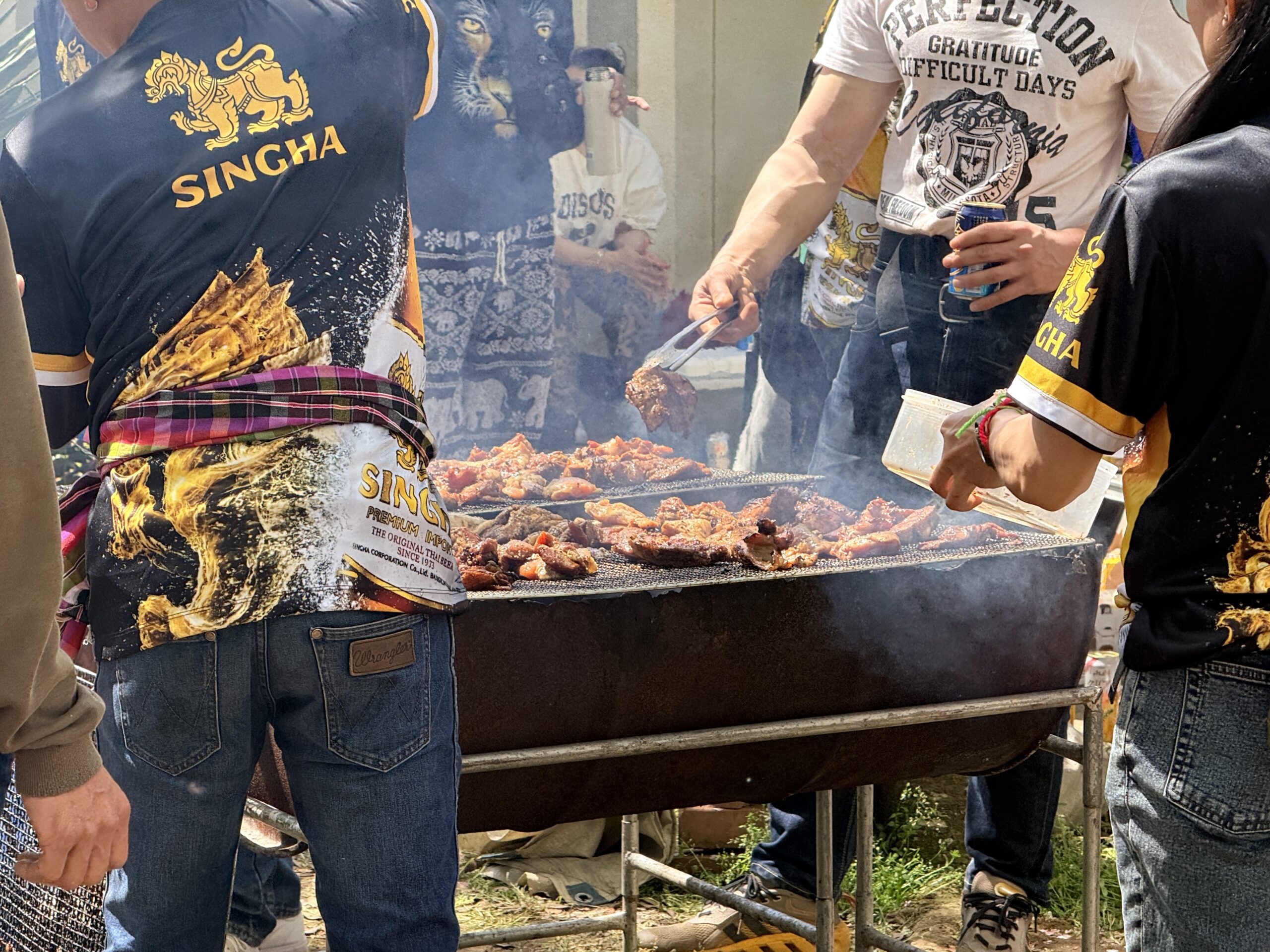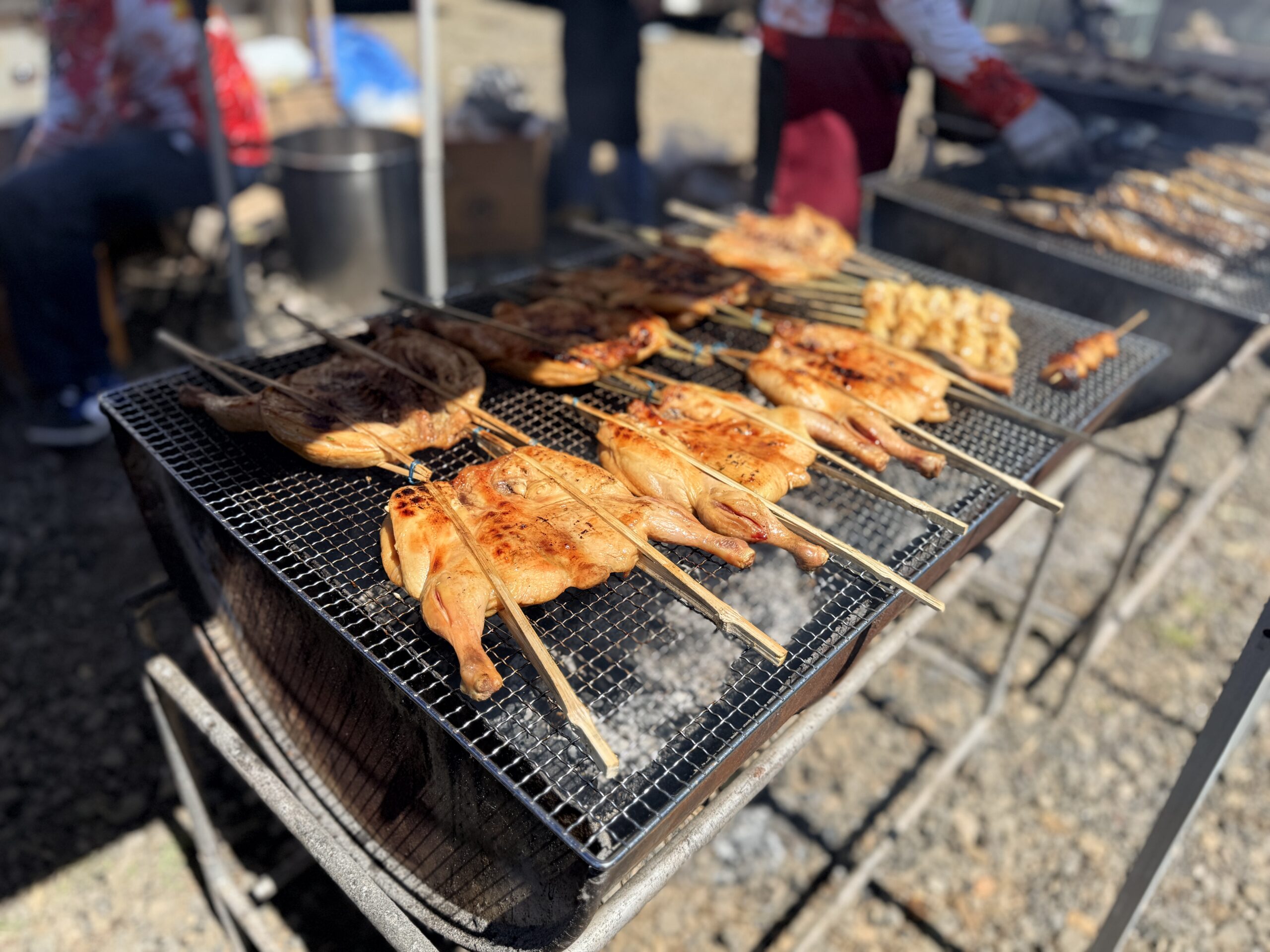 裏手に回るとまるでバーベキューパーティーのように人々が集まって肉を焼いてます。炭火で焼かれている肉が、並んだ人に次々と振る舞っていく様子が爽快でした。