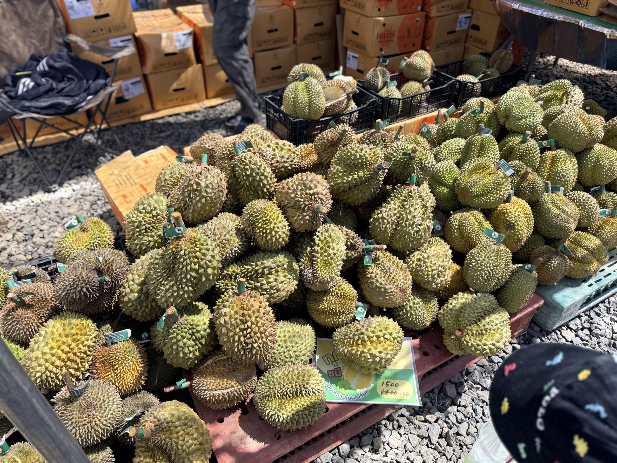 寺院の裏手は前回の記事でも紹介したとおりナーガの像があるのですが、その周辺が見事に屋台村のようになっていました。まさにタイで見たローカルマーケットの様相。マンゴーにドリアン、タイティーの屋台、食材を売っている屋台はわかるのですが、なんと「タイの宝くじ」を売っているお店もあってびっくり。