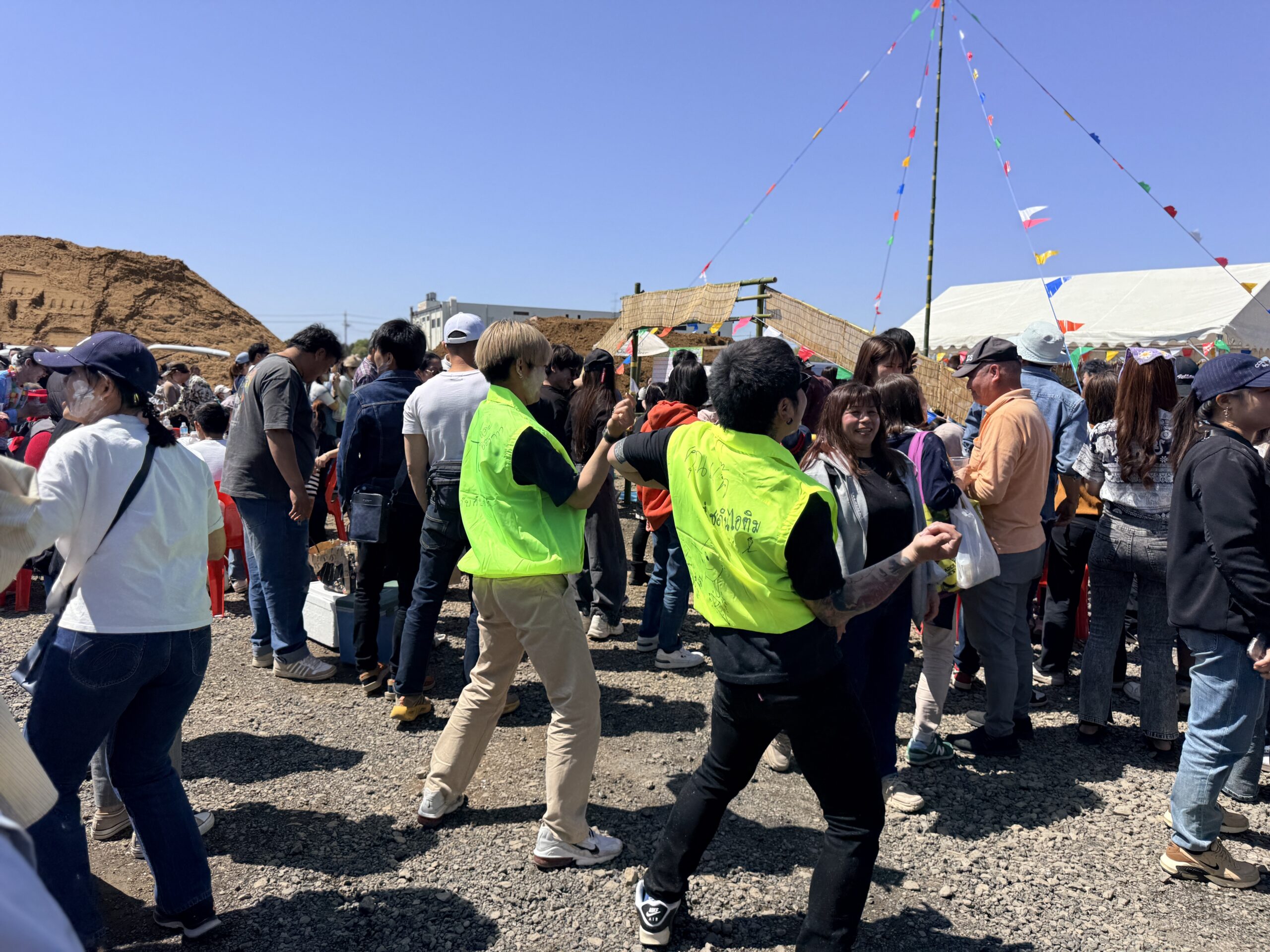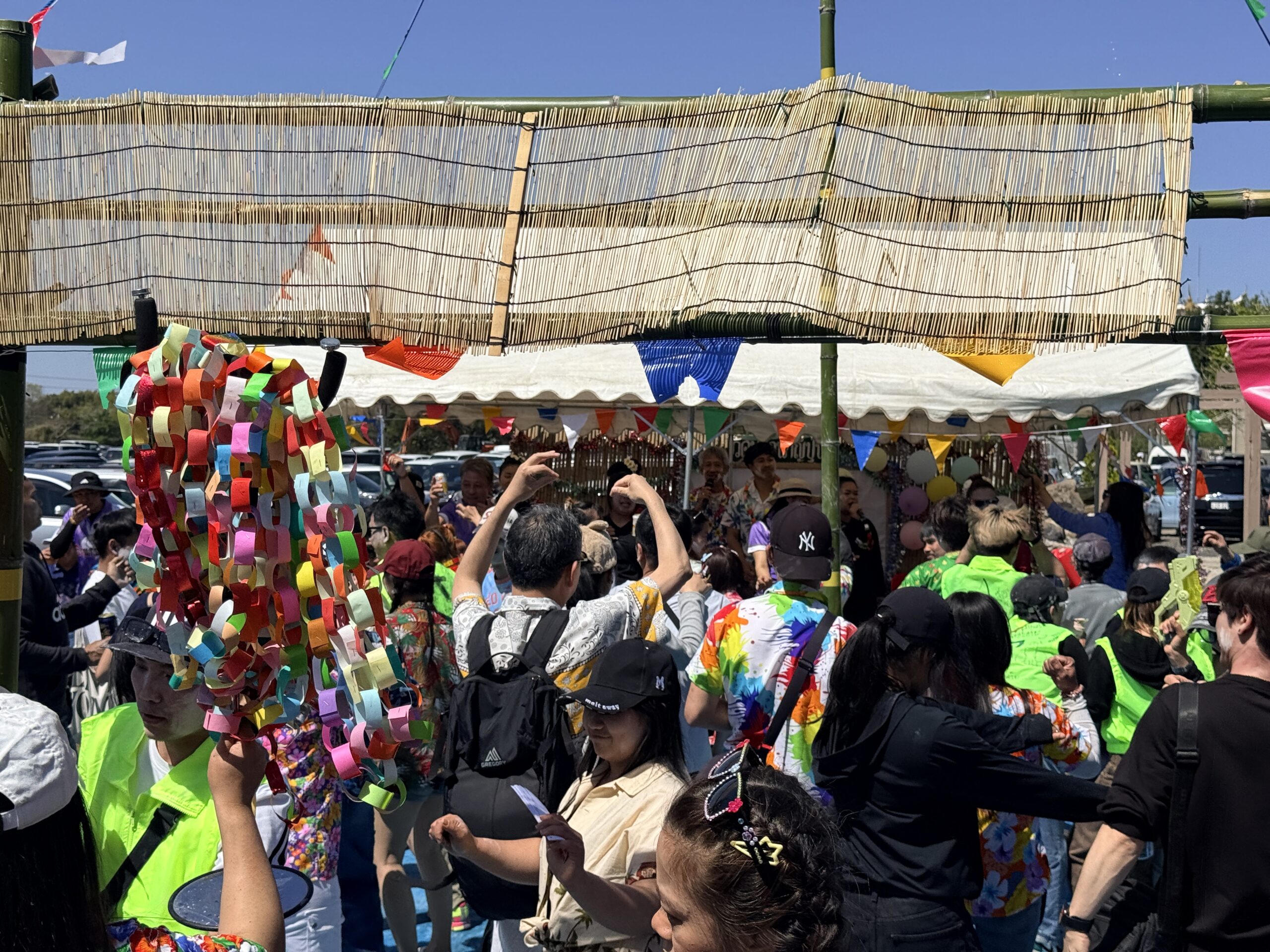 屋台村の端にはステージがあり、そこには人々が集まってタイ語の楽曲に合わせて踊っていて、楽しくなって一緒に身体を揺らしていました。ダンス会場には水鉄砲を持った人たちも集まり、水を掛けたり掛けられたり。それを見ているとどこからか水が降ってきて、筆者もしっかり濡らされました。会場は爆音ミュージックとともに笑顔と熱気が渦巻いていました。