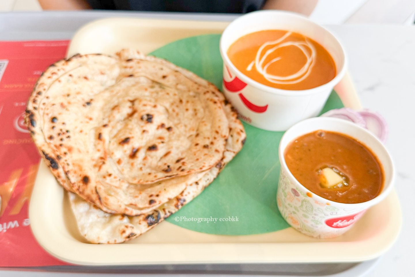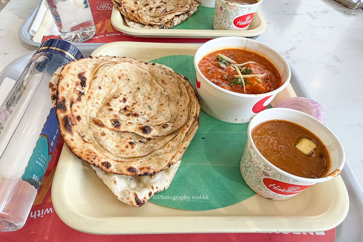 筆者が注文したのは、カレー2種類(Kadhai PaneerとDal Makhani)と小さなナン(Naan)と小さなラチャパラタ(Lachha Parantha)がセットになったコンボセット「Kadhai Paneer Combo」(298ルピー)。ドリンクは別途お水を注文しました。