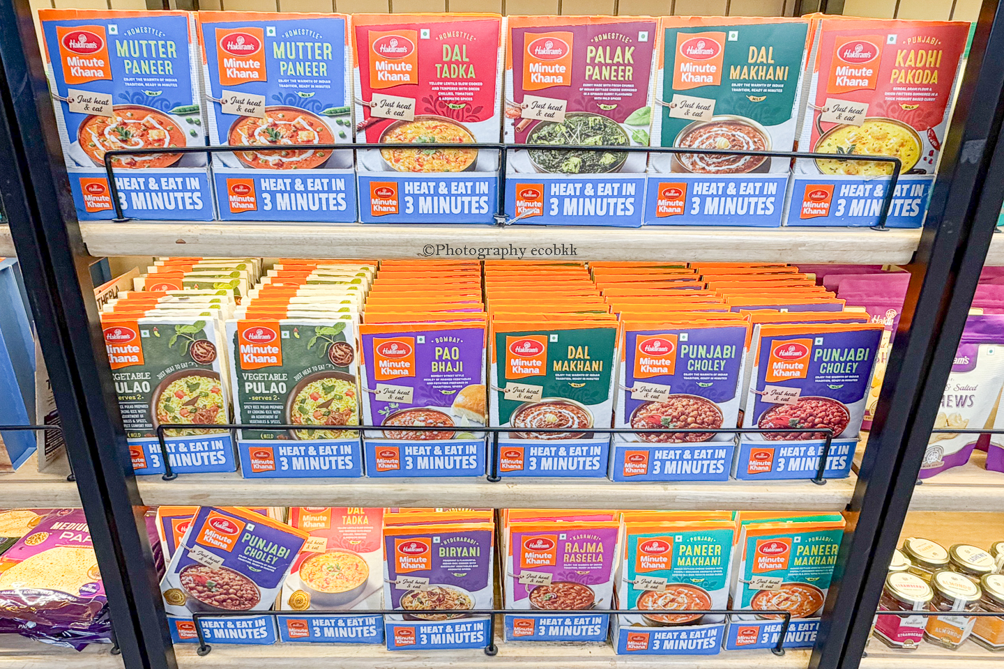 「ハルディラムス(Haldiram’s)」のカレーを教えてくれた日本人の友達から、レトルトのカレーもお土産におすすめだと教えてくれました。この日は時間がなかったので、購入しなかったのですが、後日、アンビエンスモールへ行った時に3種類買ってみました。今回おいしかった豆カレー「Dal Makhani」とほうれん草のカレー「Palak Paneer」とムンバイのストリートフードらしい「Pao Bhaji」という3種類。店頭で選ぶのは画像がなく、インド料理に詳しくない筆者には難しかったのですが、レトルト商品には写真もついていて、選びやすかったです。自宅でも試したい価格帯と味わいで、商品によって値段が異なり、1袋につき、80~130ルピー位で色々試せるのも嬉しいなと感じました。アンビエンスモールでは、豪華にデコレートされたナッツ類の販売もあり、ベジタリアンのインド人へのお土産を購入する場所としてもよさそうでした。