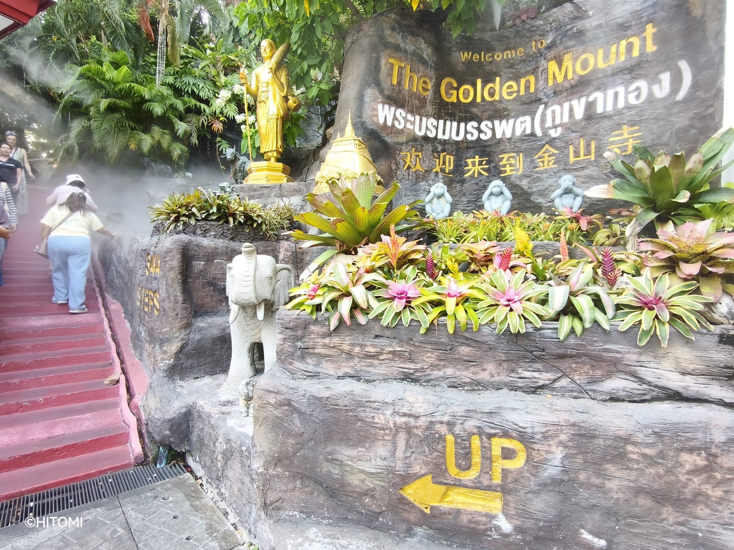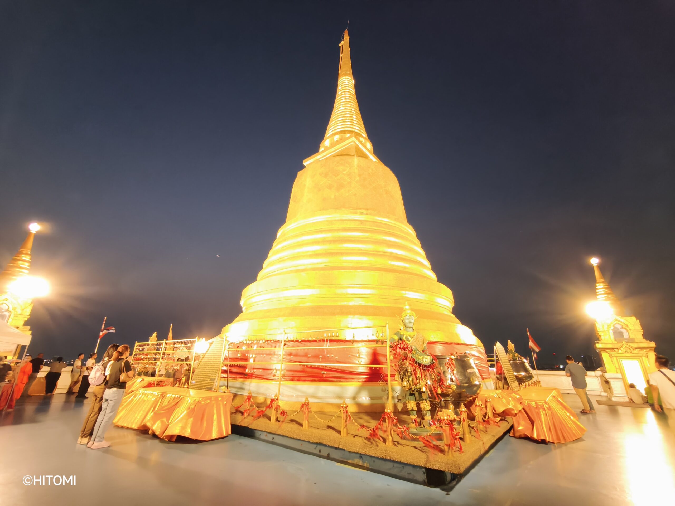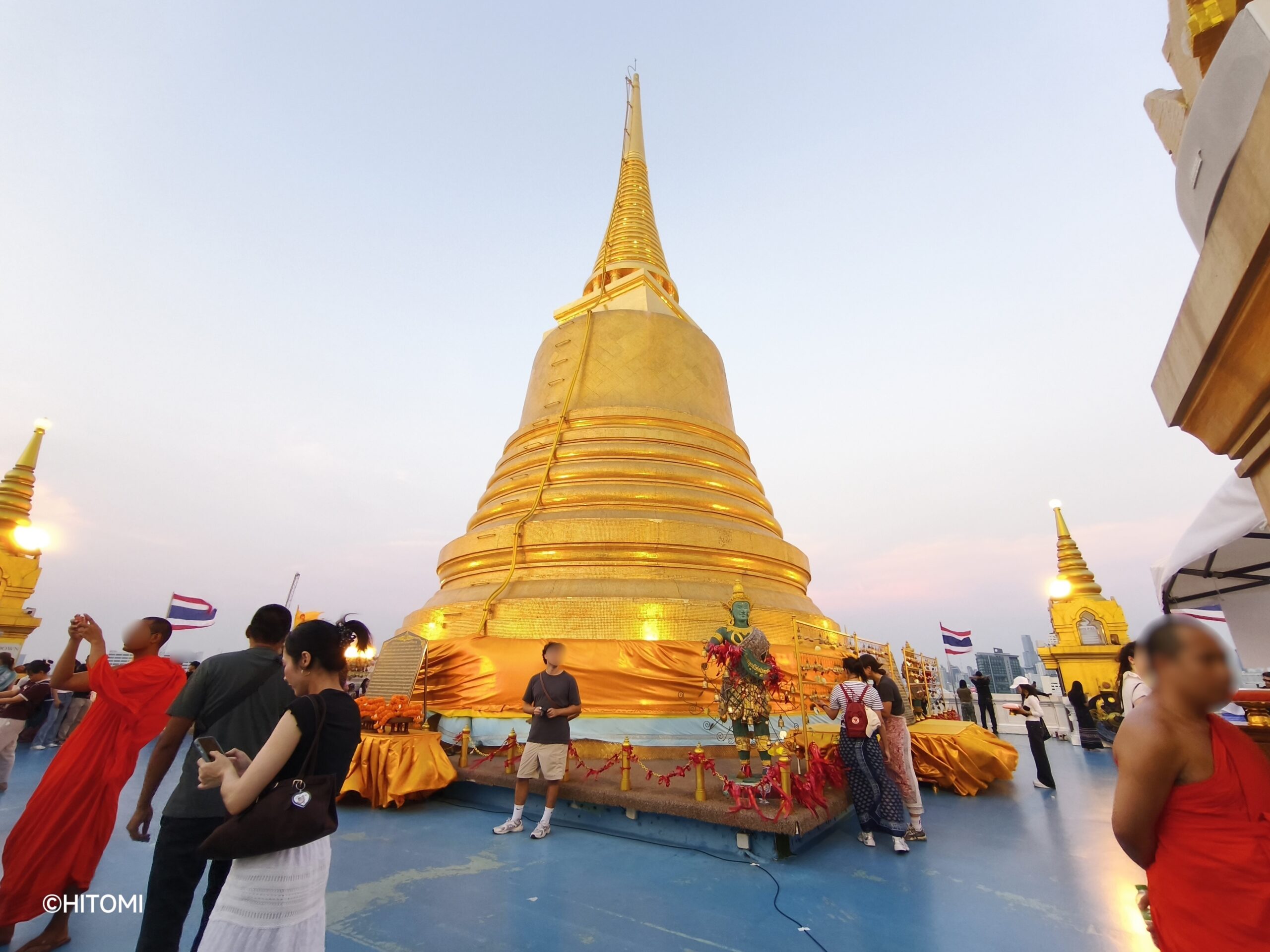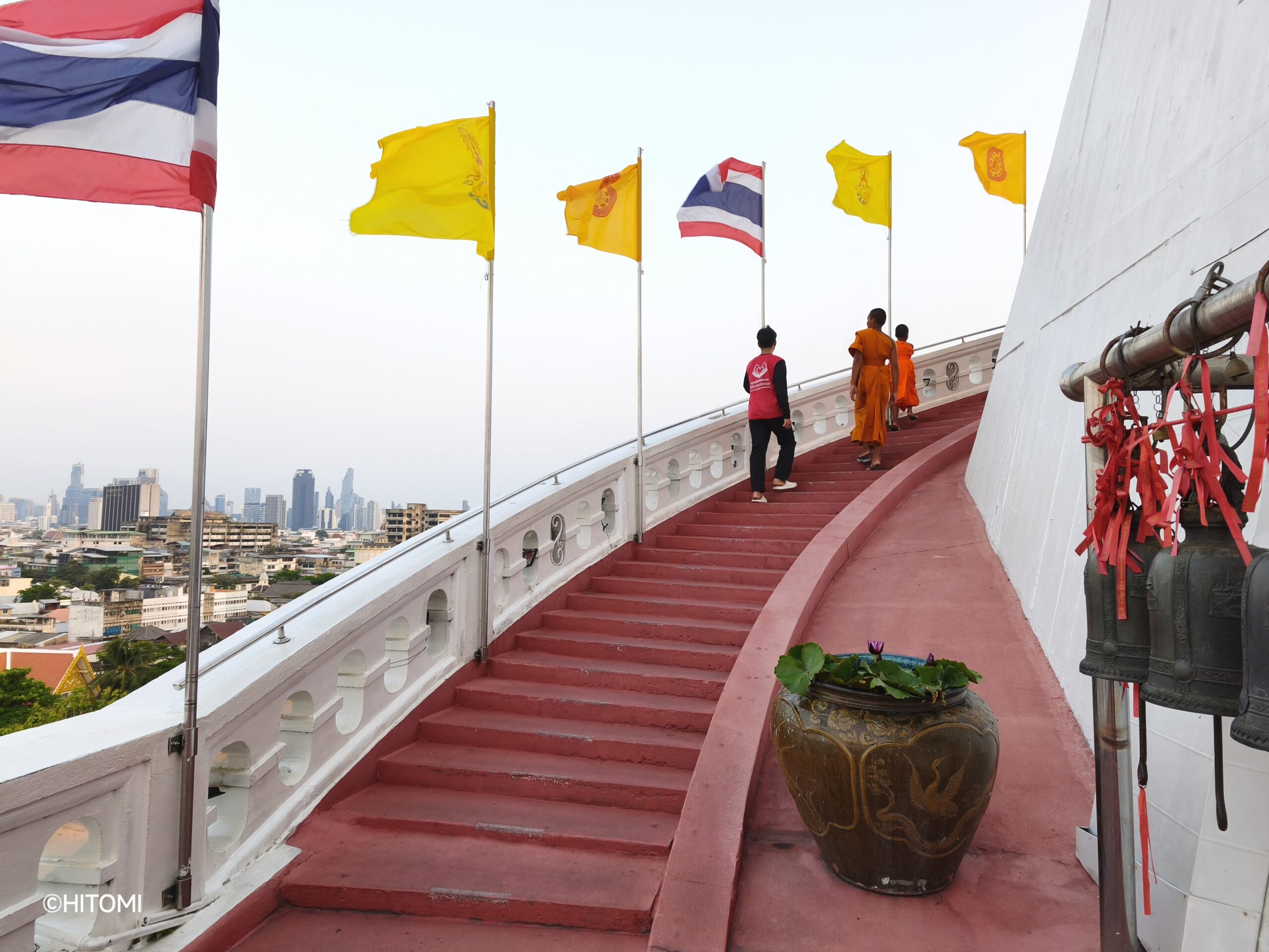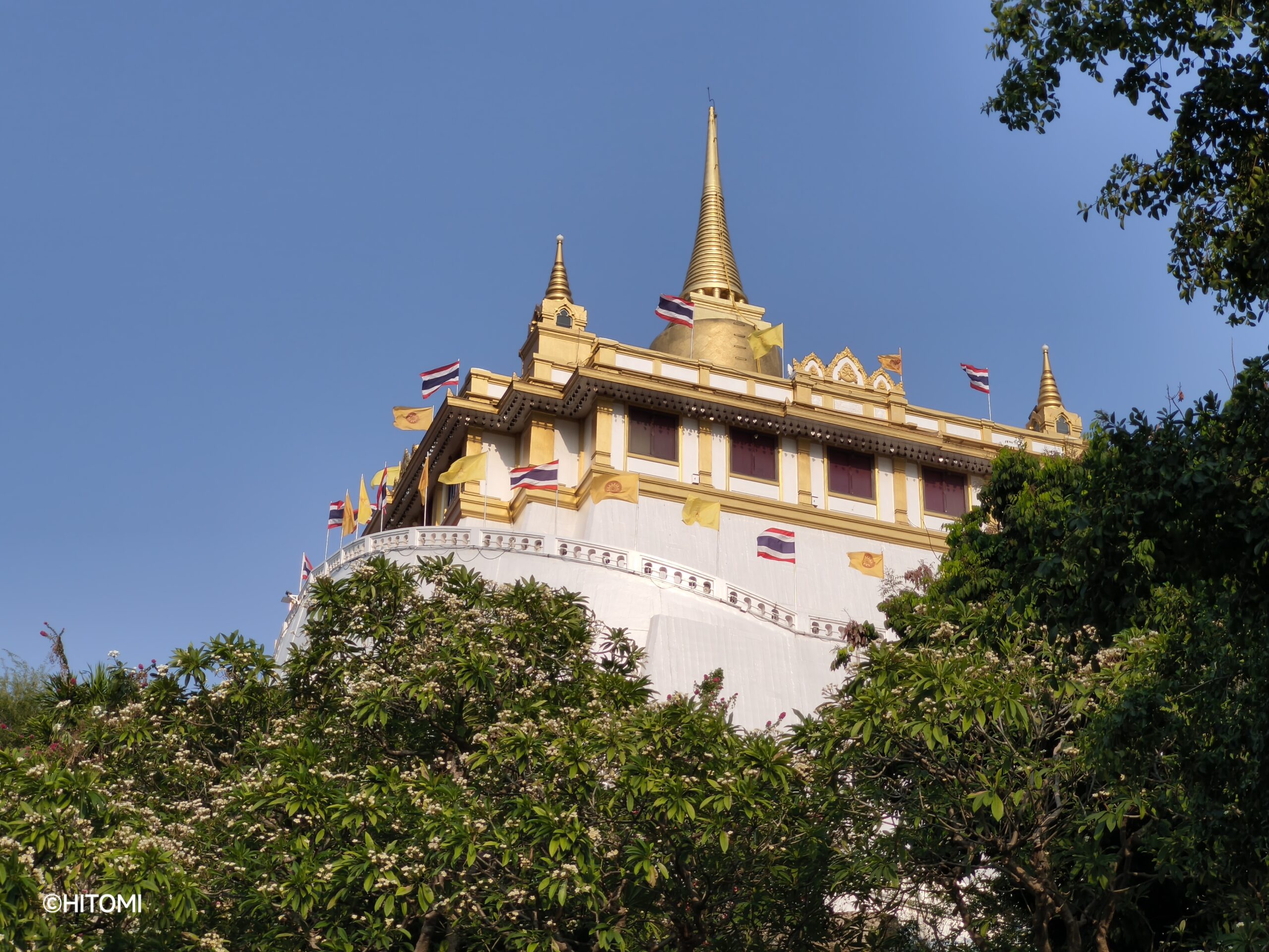黄金の仏塔には「プラボロムバンポット」という正式名称がありますが、“黄金の山”を意味する「プーカオ・トーン(Golden Mount)」の名で広く知られています。完成当時は周囲に高い建物が一切なく、地上から見上げるとまさに黄金の山のように見えたからでしょう。現在でも旧市街では高層建築が制限されており、歴史的建造物の景観が守られています。