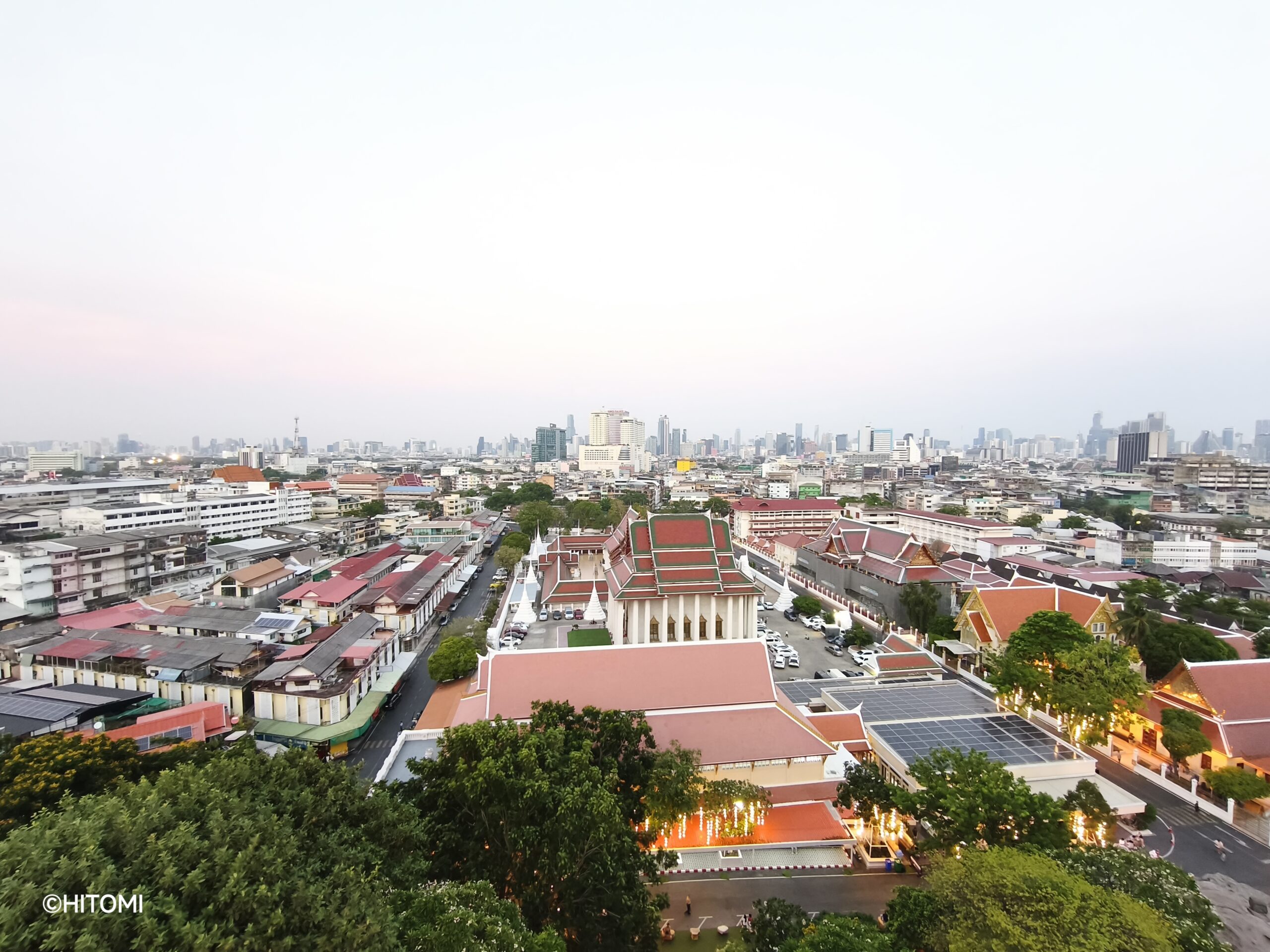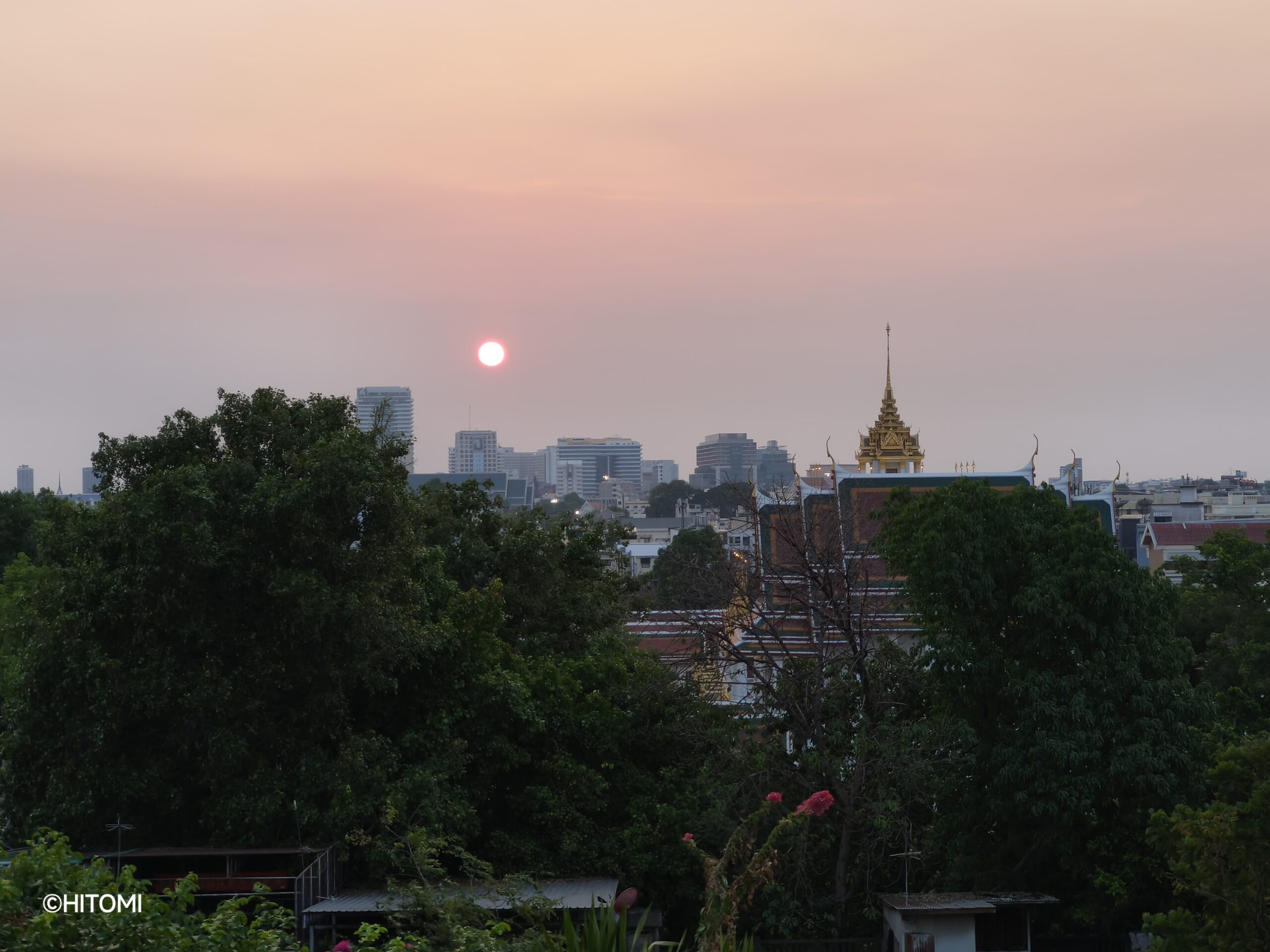 多くの寺院が18時頃に閉まる中、ワット・サケットは19時まで開いているため、夕方からの観光にもぴったりです。5月半ばの雨季入り前であればスコールの心配も少ないので、ぜひ黄金の仏塔と頂上からのバンコクの景色を楽しんでみてください。サンセットもとてもきれいでしたよ。