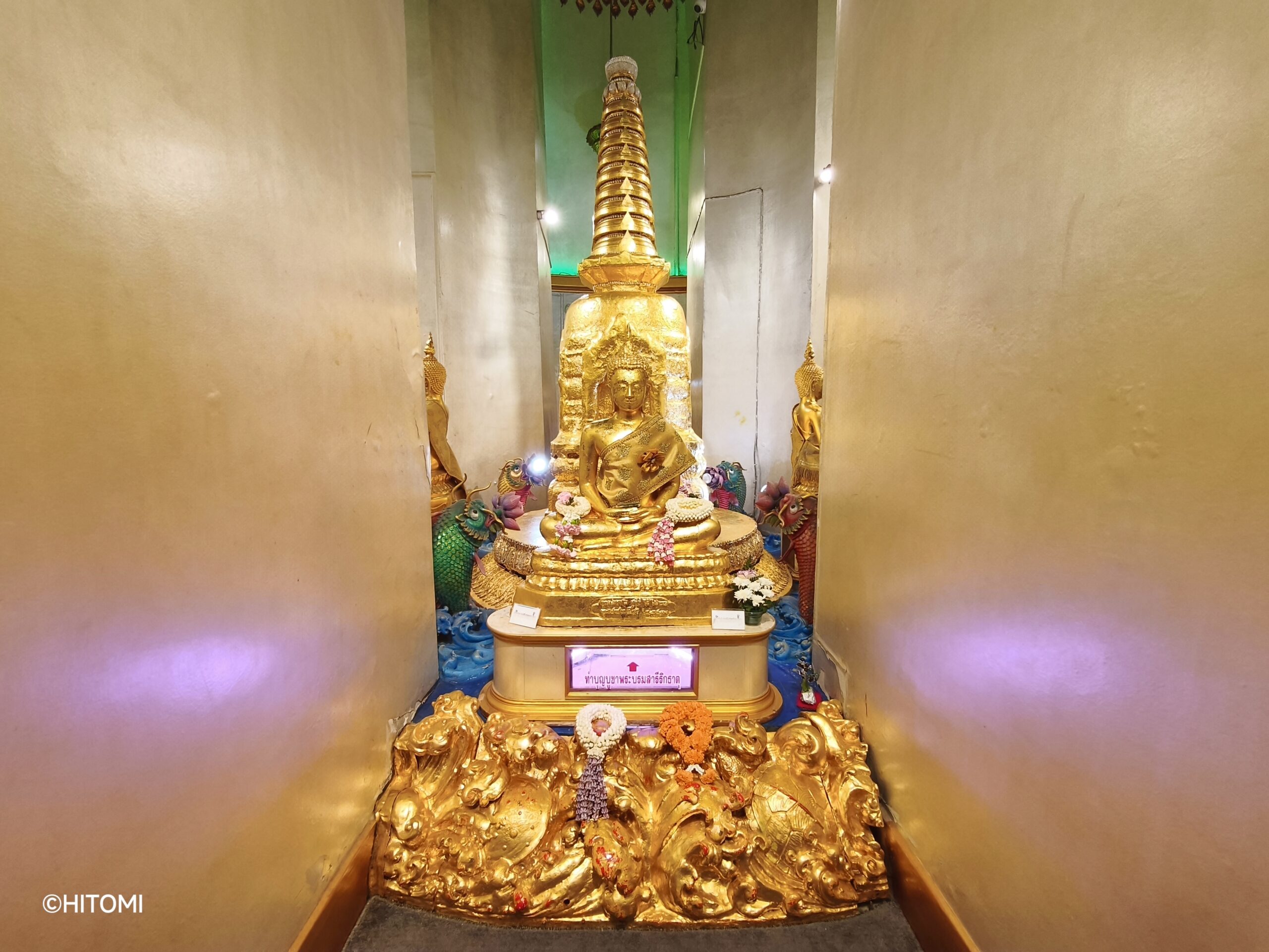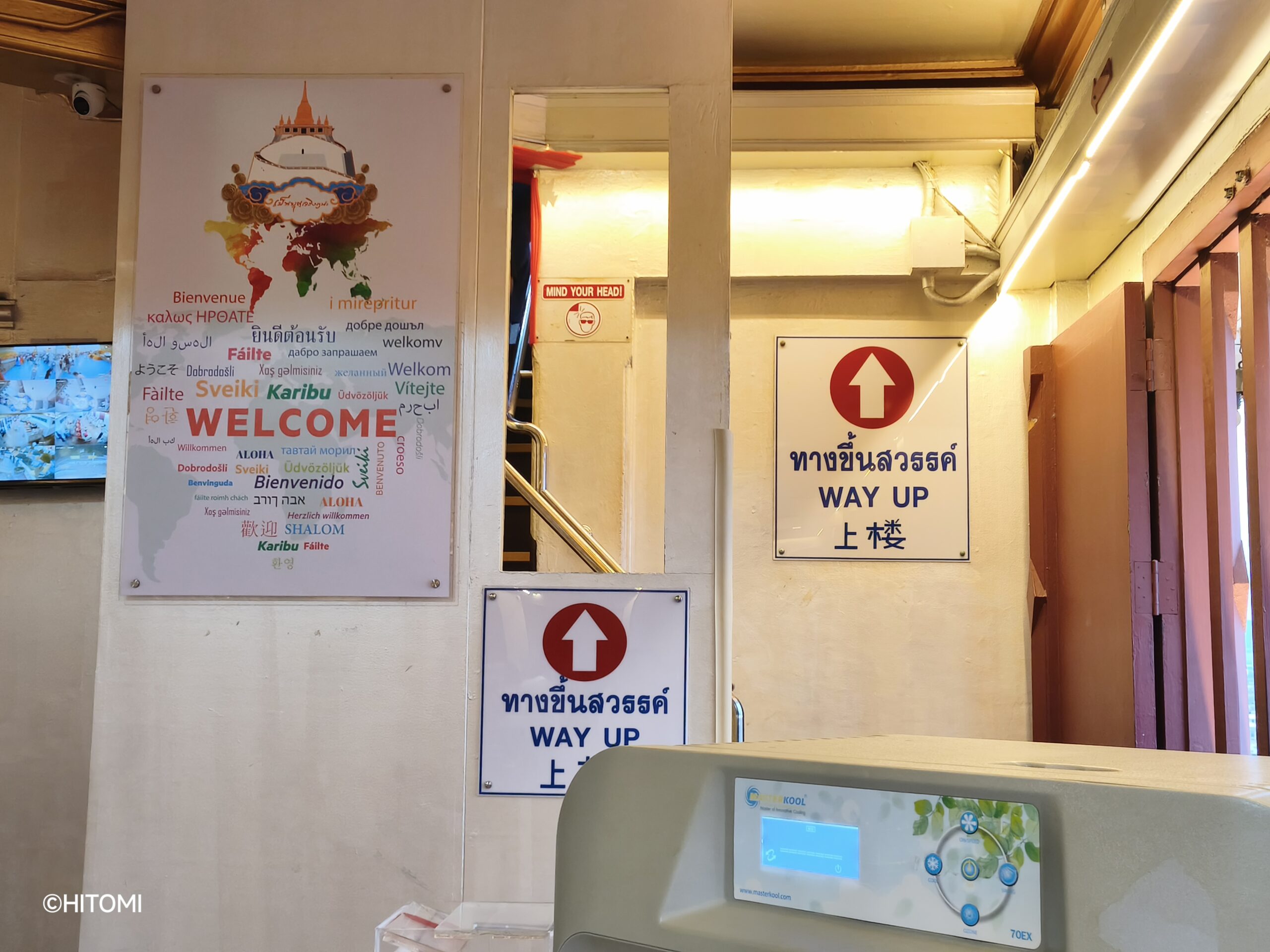 いよいよ、仏塔へと続く344段の階段へ。塔の周囲をらせん状にぐるりと上っていきます。階段を上りきると、仏塔の真下にある御堂へとたどり着きます。その右手には、さらに上へと続く狭い階段があります。案内板には英語では「WAY UP」と書かれていますが、タイ語では「天国への階段(タイ語:ทางขึ้นสวรรค์)」と記されており、思わずほほえんでしまいました。