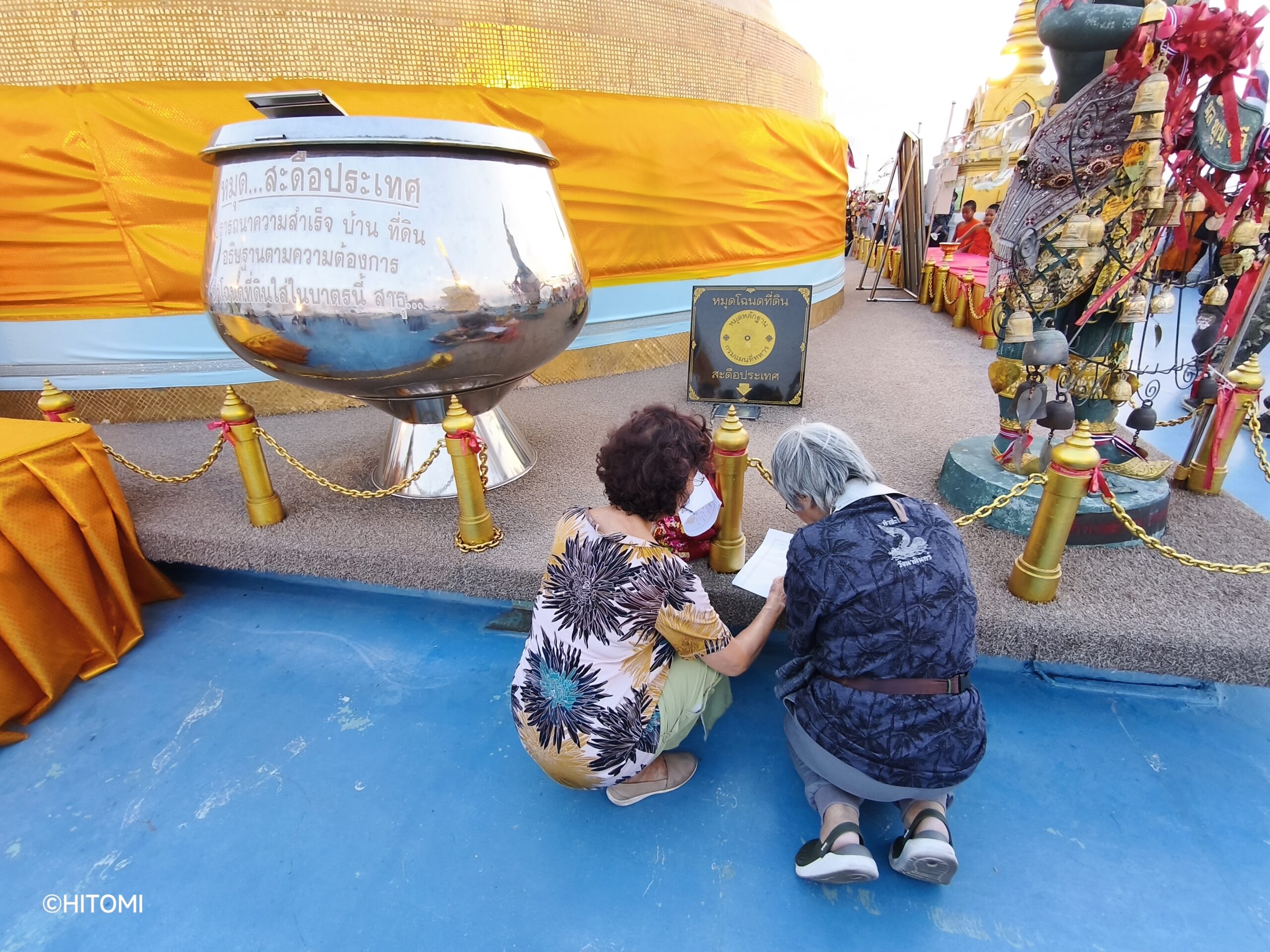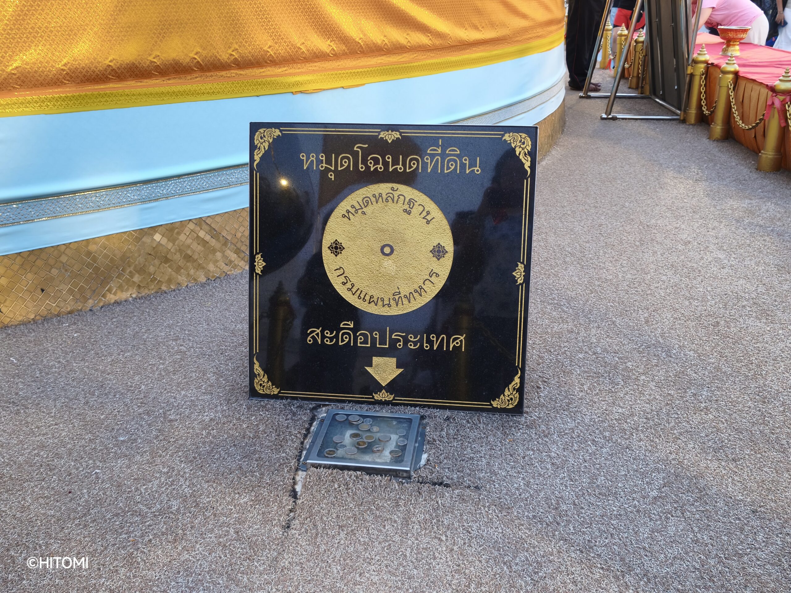 仏塔の脇には、「国のへそ(タイ語:สะดือประเทศ)」と刻まれた標石があります。かつてタイ政府がカッシーニ図法を用いて測量した際、この位置がタイの中心、つまり「へそ」と認定されました。現在はより正確なメルカトル図法が用いられたため、この地点は中心ではなくなりましたが、代わりに土地や住宅に関する願掛けのパワースポットとして広く知られるようになりました。この日も、土地の登記簿を手に熱心に祈願する人の姿が見られました。