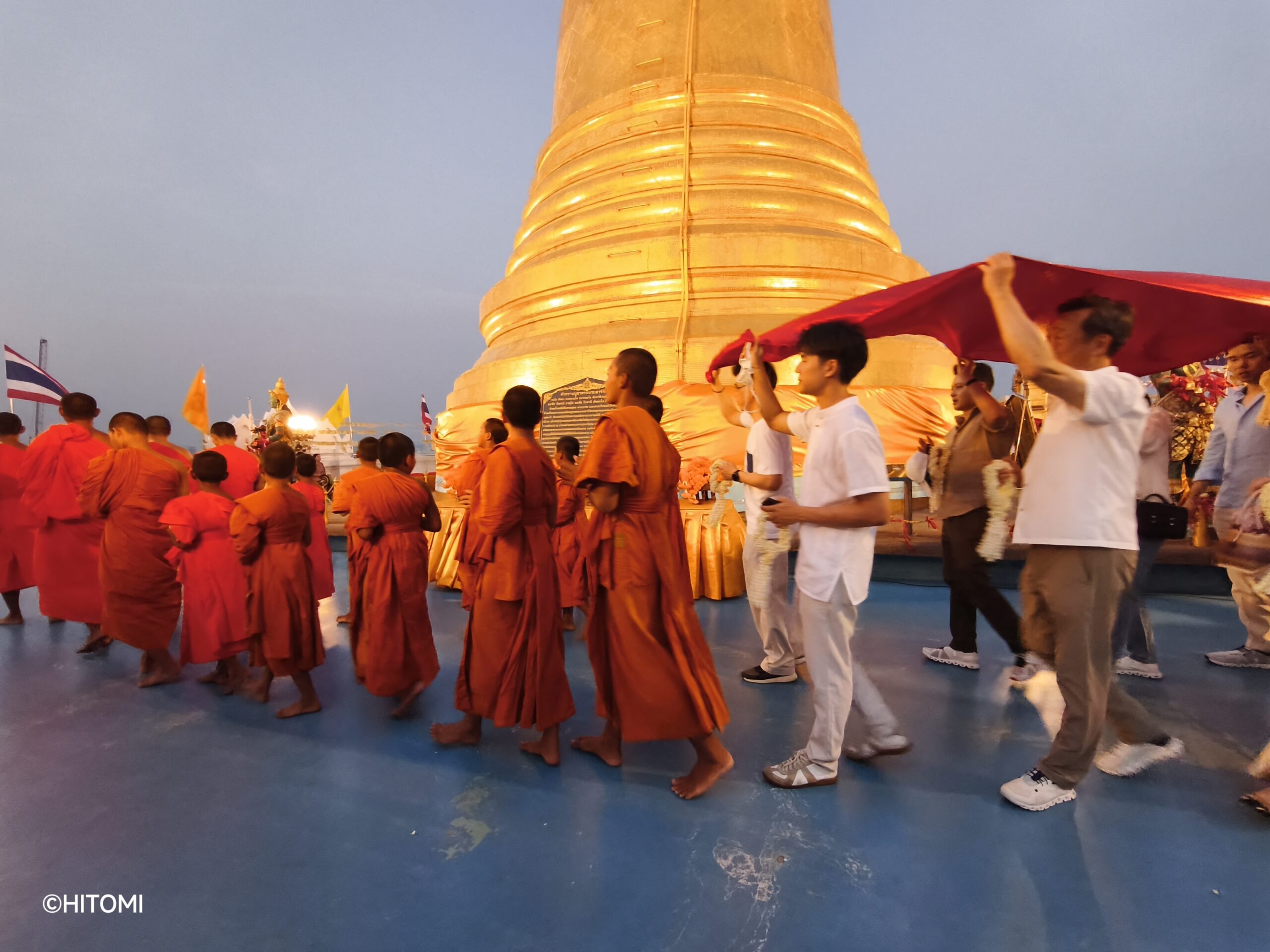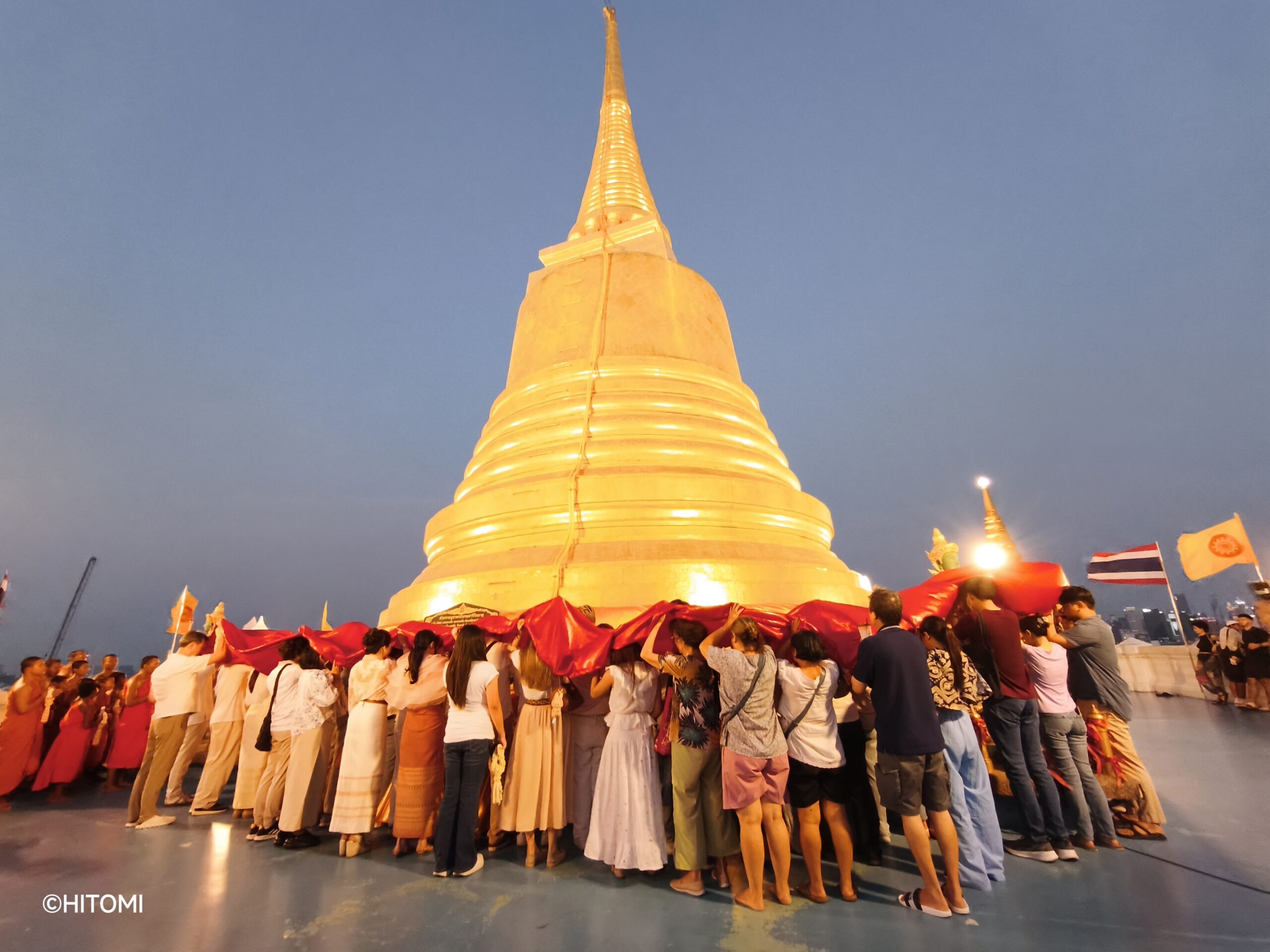 仏塔前では、タムブン(布施)として花輪や僧侶の袈裟を奉納することができます。この日は偶然、団体の参拝客が赤い布を奉納して仏塔に巻きつける儀式に遭遇しました。約40人の参拝客が僧侶の後に続き、赤い布を頭上に掲げながら仏塔の周囲を3周。その後は僧侶に続いてお題目を唱えていました。最後に男性のみが布を仏塔に巻きつけ、厳かな雰囲気の中で儀式は終了しました。