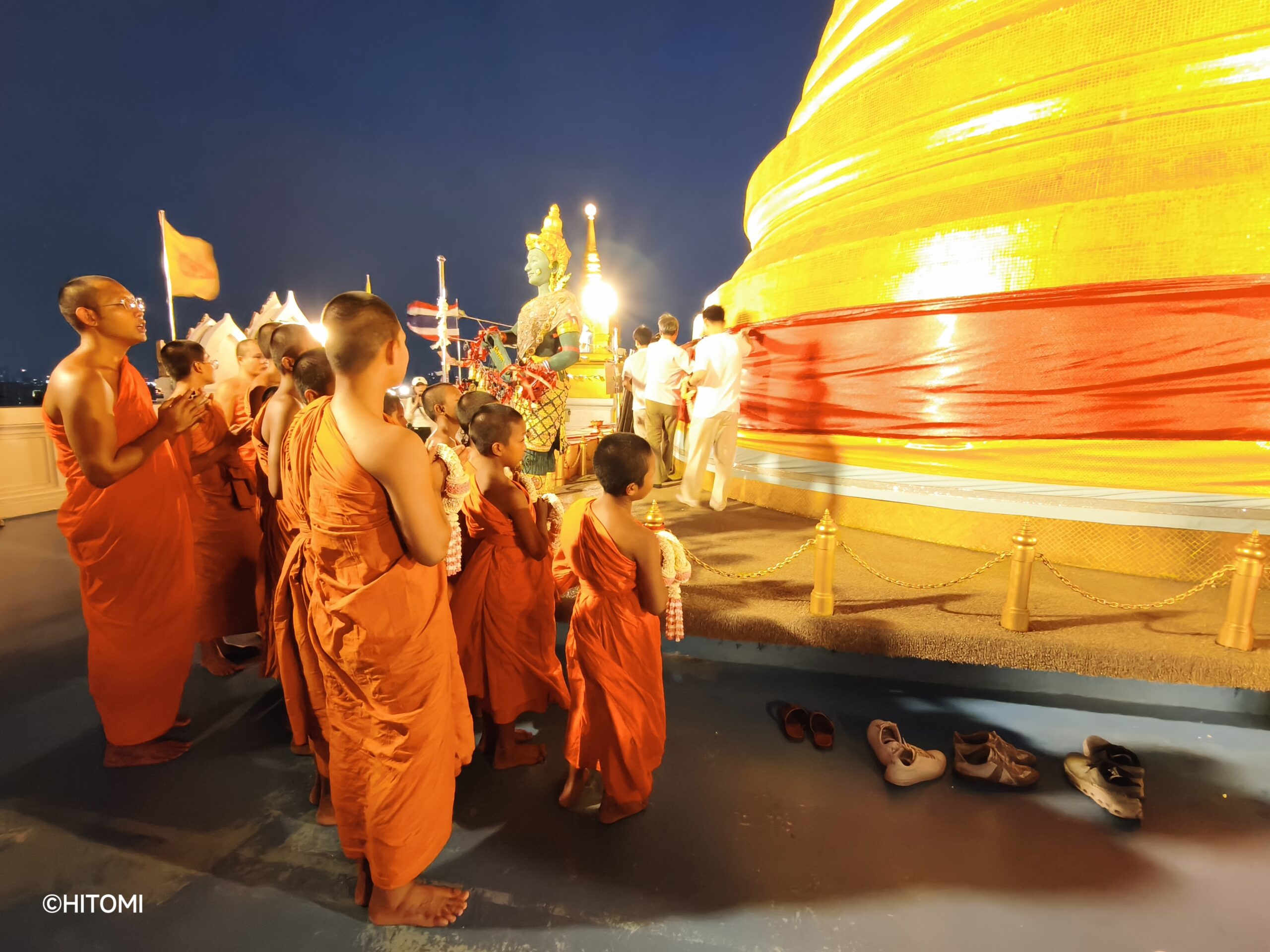 帰り際に仏塔の真下に祀られた仏舎利にお詣りをしてから寺院を後にしました。夜の旧市街は、各所の寺院がライトアップされており、バンコクの町の美しさを再確認しました。