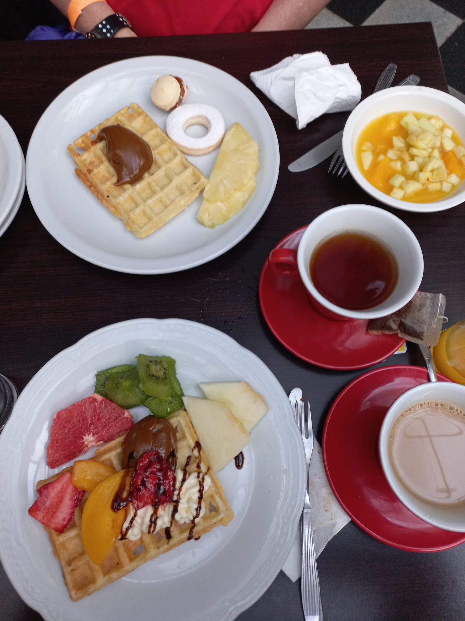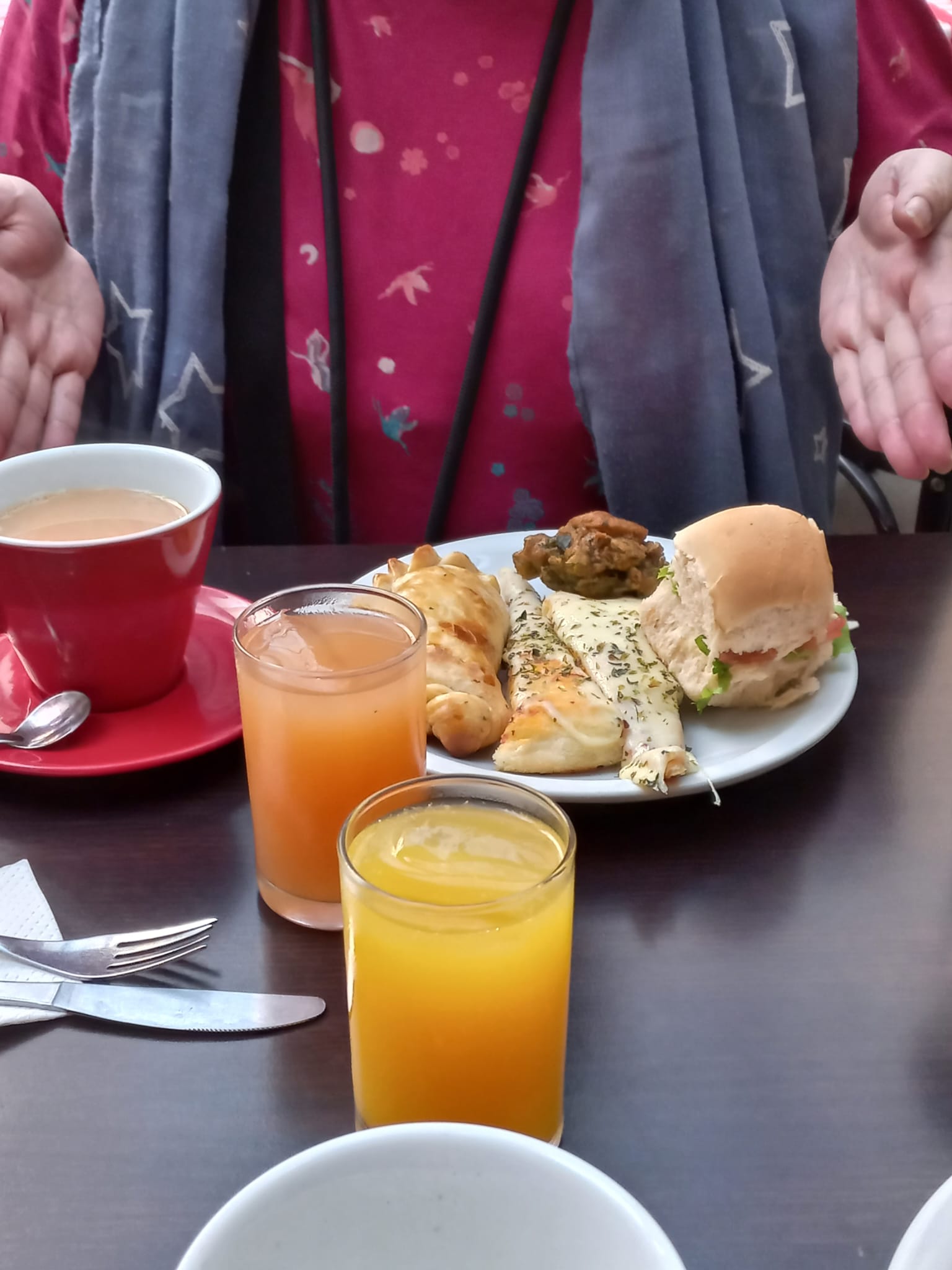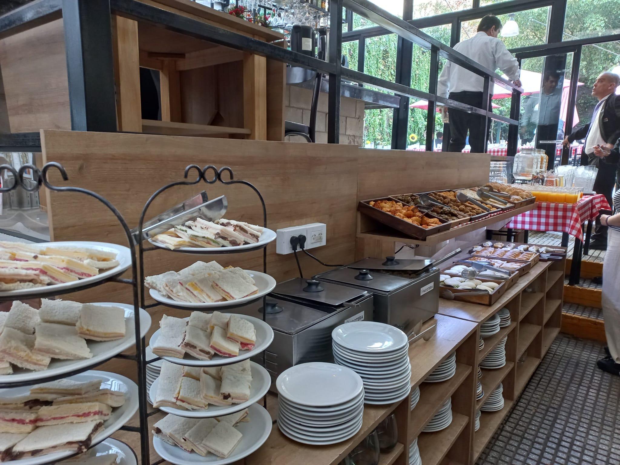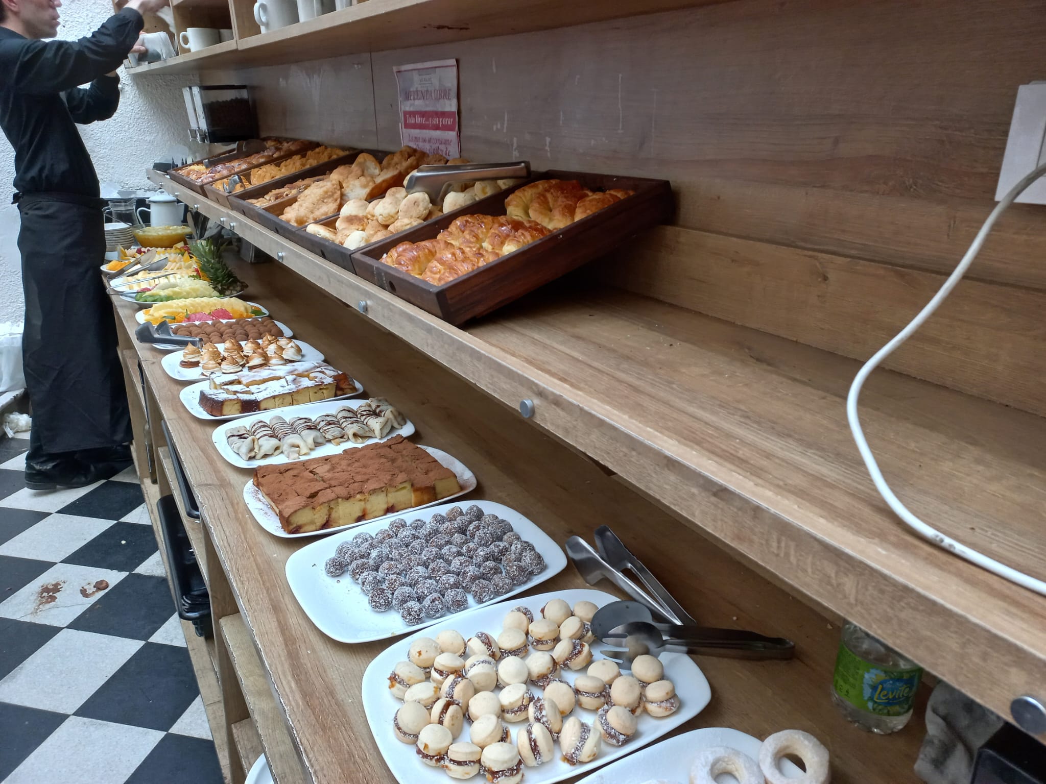 コーヒー(café)、紅茶(té)、ジュース(jugo)各種が用意され、スタッフがすぐにおかわりを提供してくれます。ジュースは並んでサーブしてもらえます。