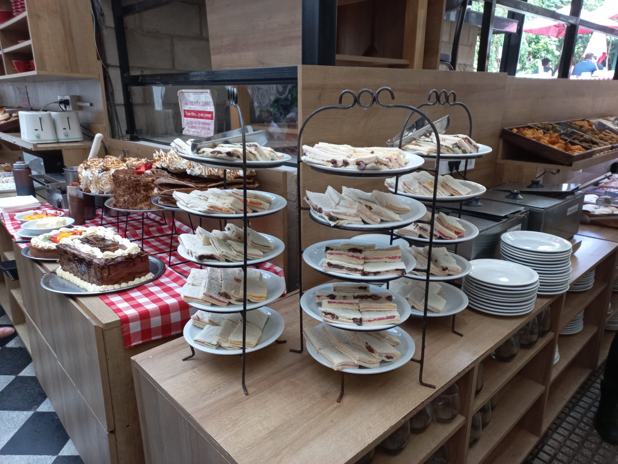 薄いパンにハムやチーズを挟んだブエノスアイレスでのアフタヌーンティーの定番「sándwiches de miga(サンドゥィチェス・デ・ミガ)」が、5層のタワーで、また巨大ケーキが見られる圧巻の演出。