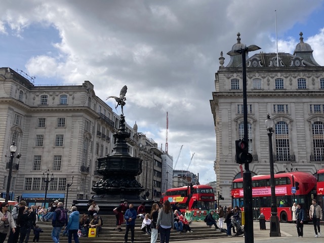 ロンドン繁華街中心のひとつ、ピカデリーサーカス。観光やショッピングはもちろんミュージカルなどを上演する劇場も周辺に多く、ロンドン滞在中に行く機会が多いでしょう。