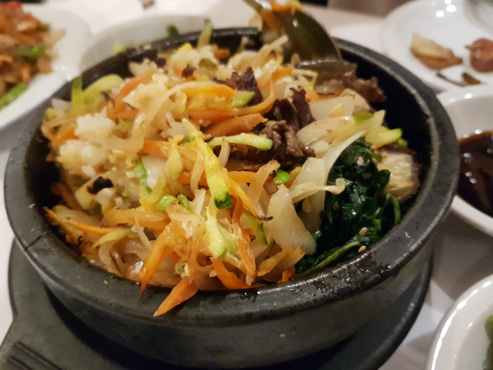 そして、熱々の器で出てきた韓国の釜めし風ごはん、トルソッ・ビビンバ。石鍋の中でご飯が香ばしく焼け、具材を混ぜるたびに香りが立ちのぼる一品で、最後まで飽きずに楽しめます。