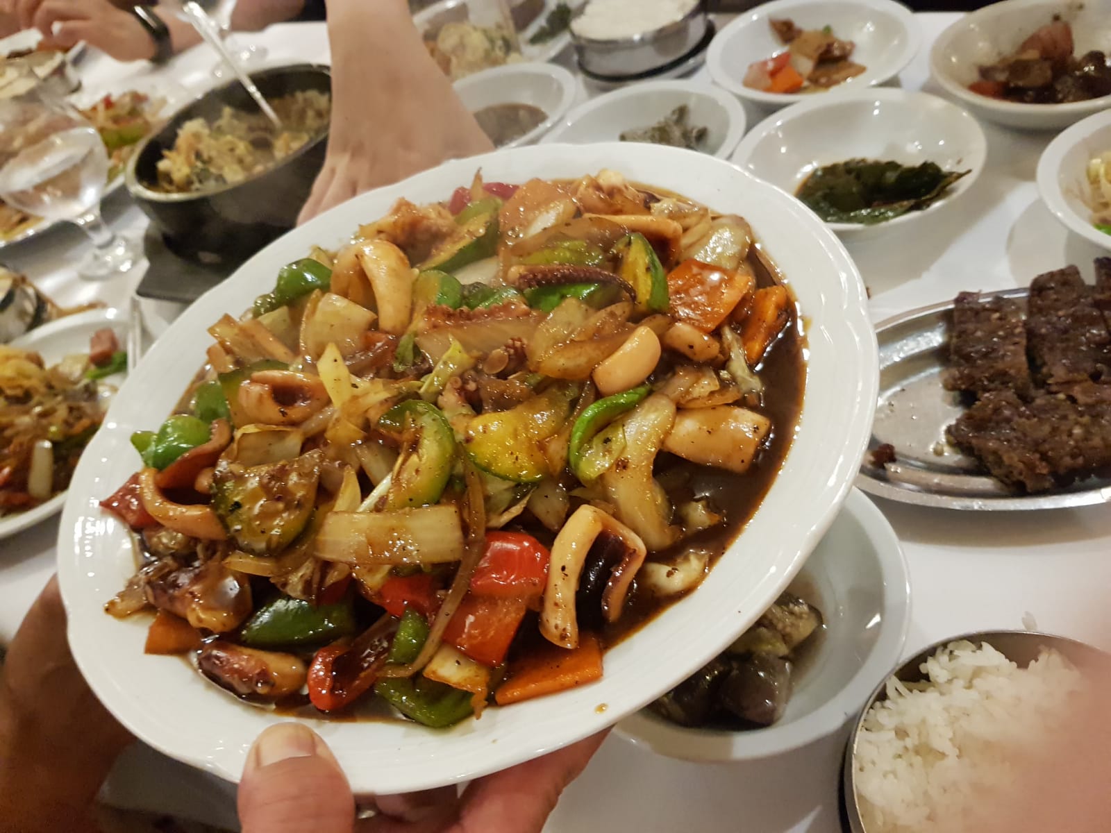 さらに、テーブルを華やかにしてくれたのが海鮮炒め。魚介の旨みがしっかり感じられ、韓国料理らしい力強い味つけの中にも、素材の存在感がありました。量もたっぷりで一つでいいよ、と教えてくれただけありました。