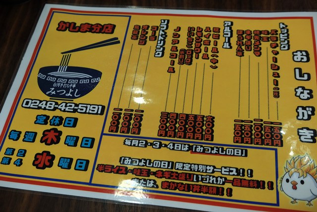 矢吹町小松にある「みつよし」へ行って来ました。白河ラーメンの名門「やたべ」系に属する”かしま”の分店で、2年前にオープンした新鋭のお店です。