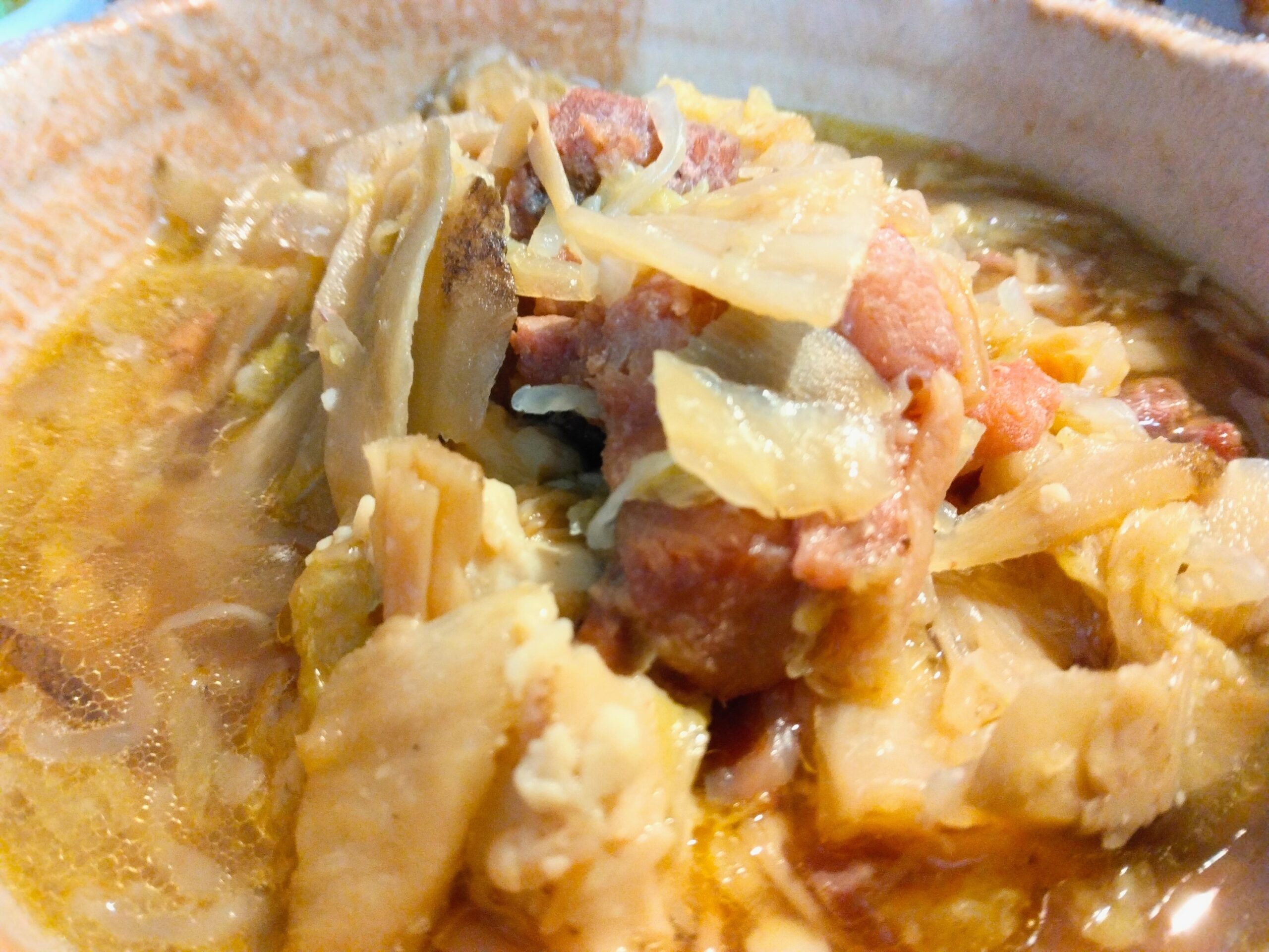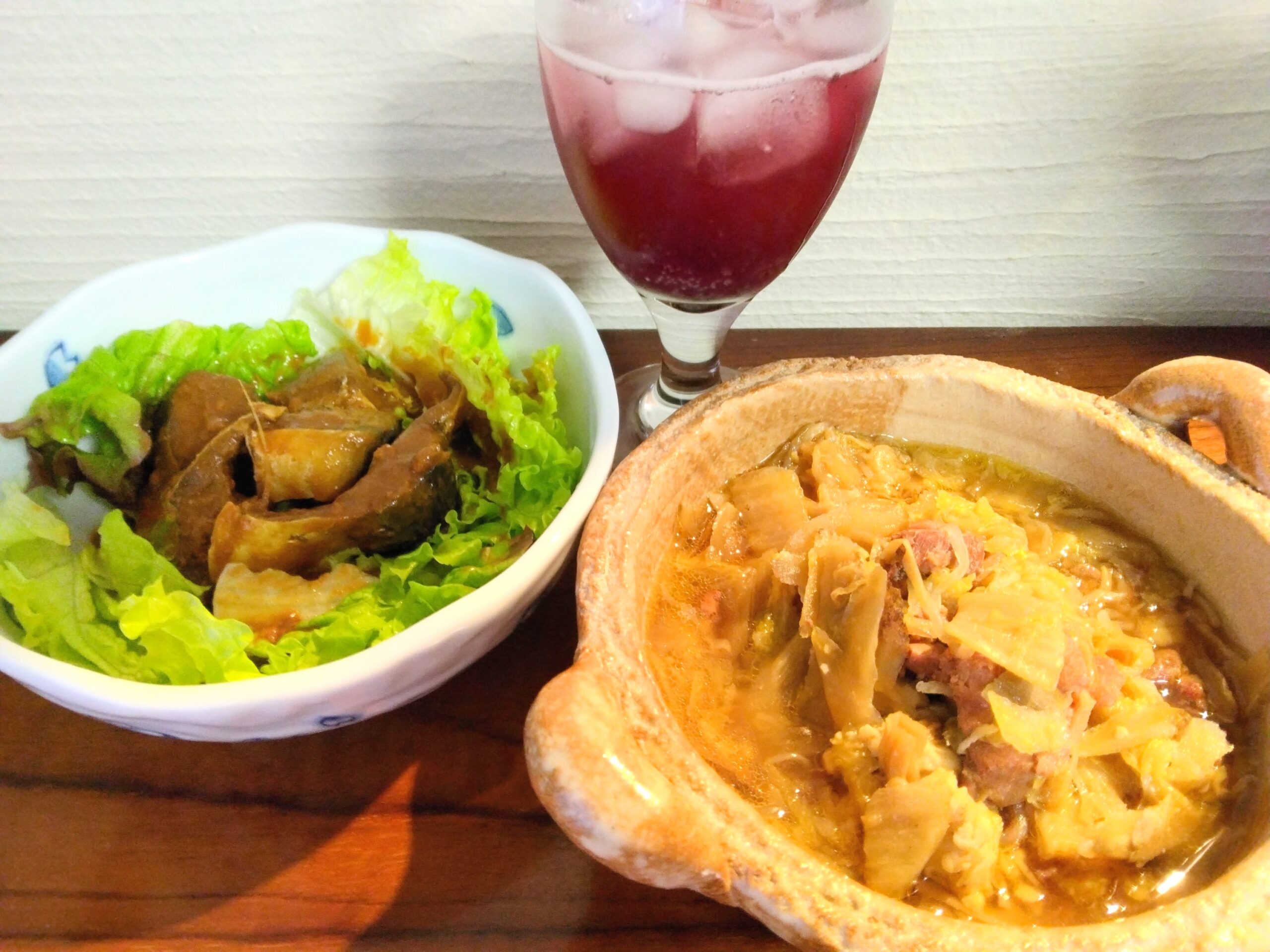 鶏肉のほか、白菜、焼き豆腐、糸コンニャク、ゴボウ、エノキ、シイタケなど具沢山で、「マルヨシ醤油」の濃い口しょうゆが入っています。ごぼうやタレのいい香りがただよい、食欲を刺激してくれました。内容量は2人前ですので、分け合って食べても、ひとりで心ゆくまで食べてもいいですね。