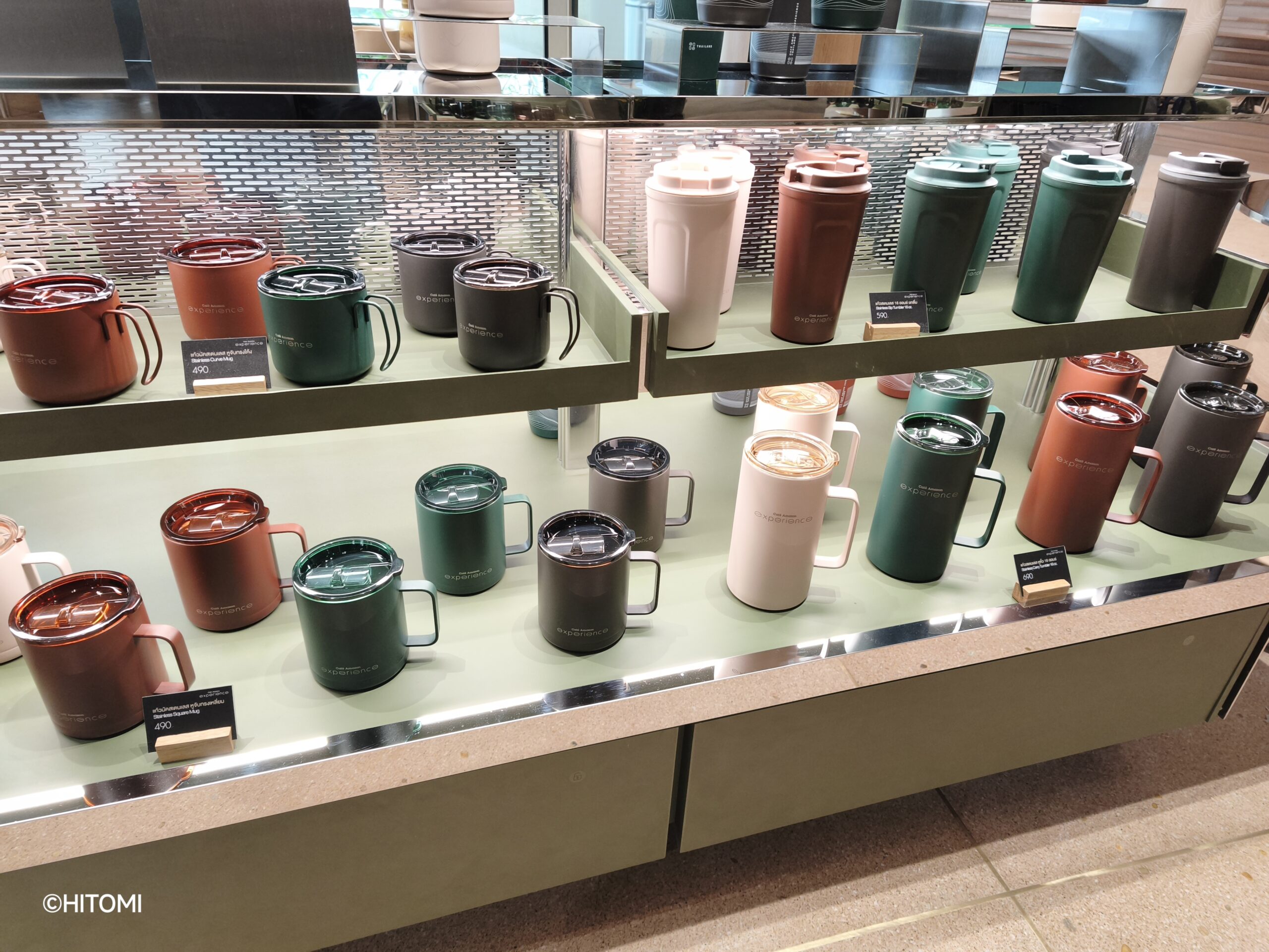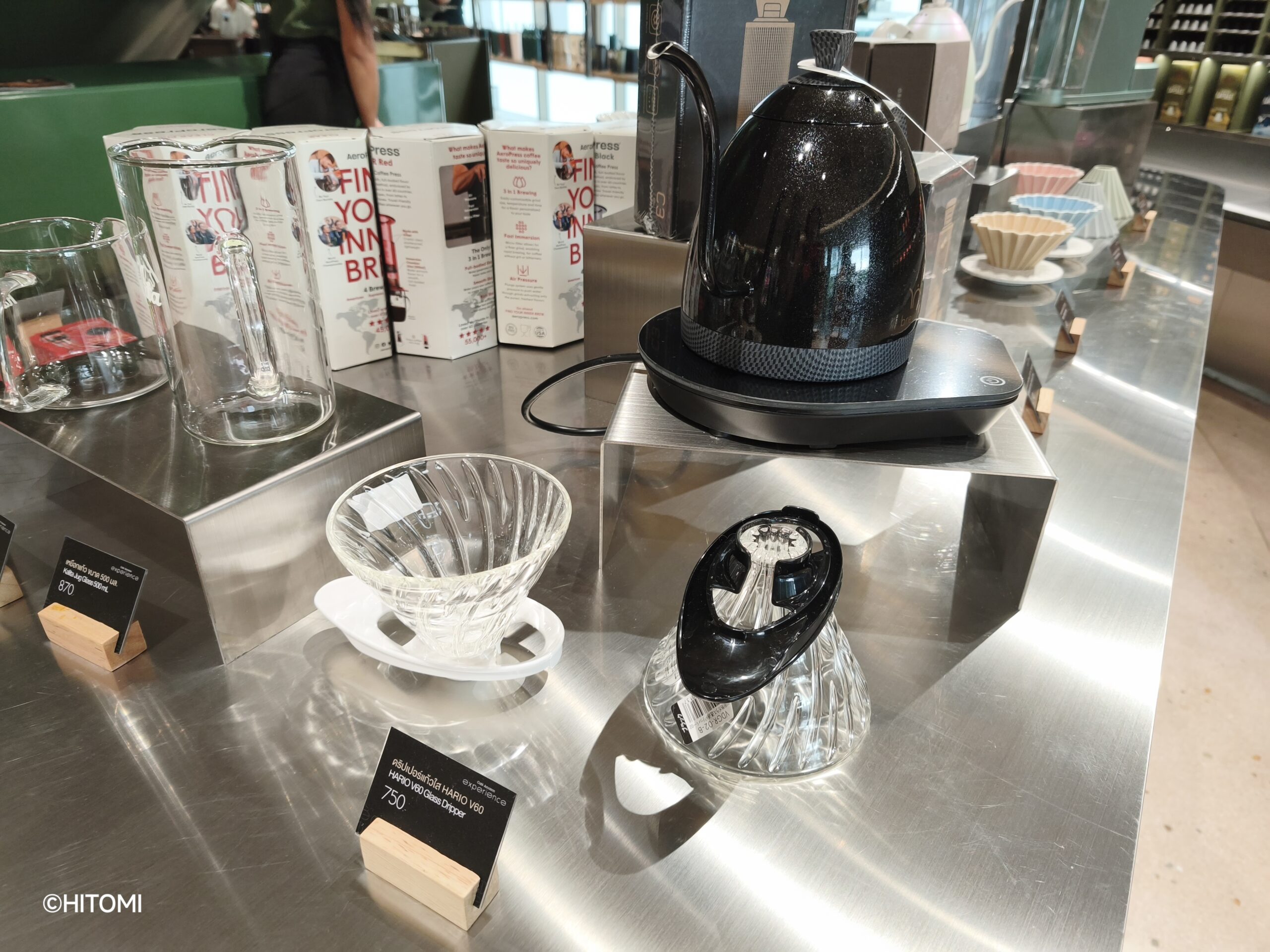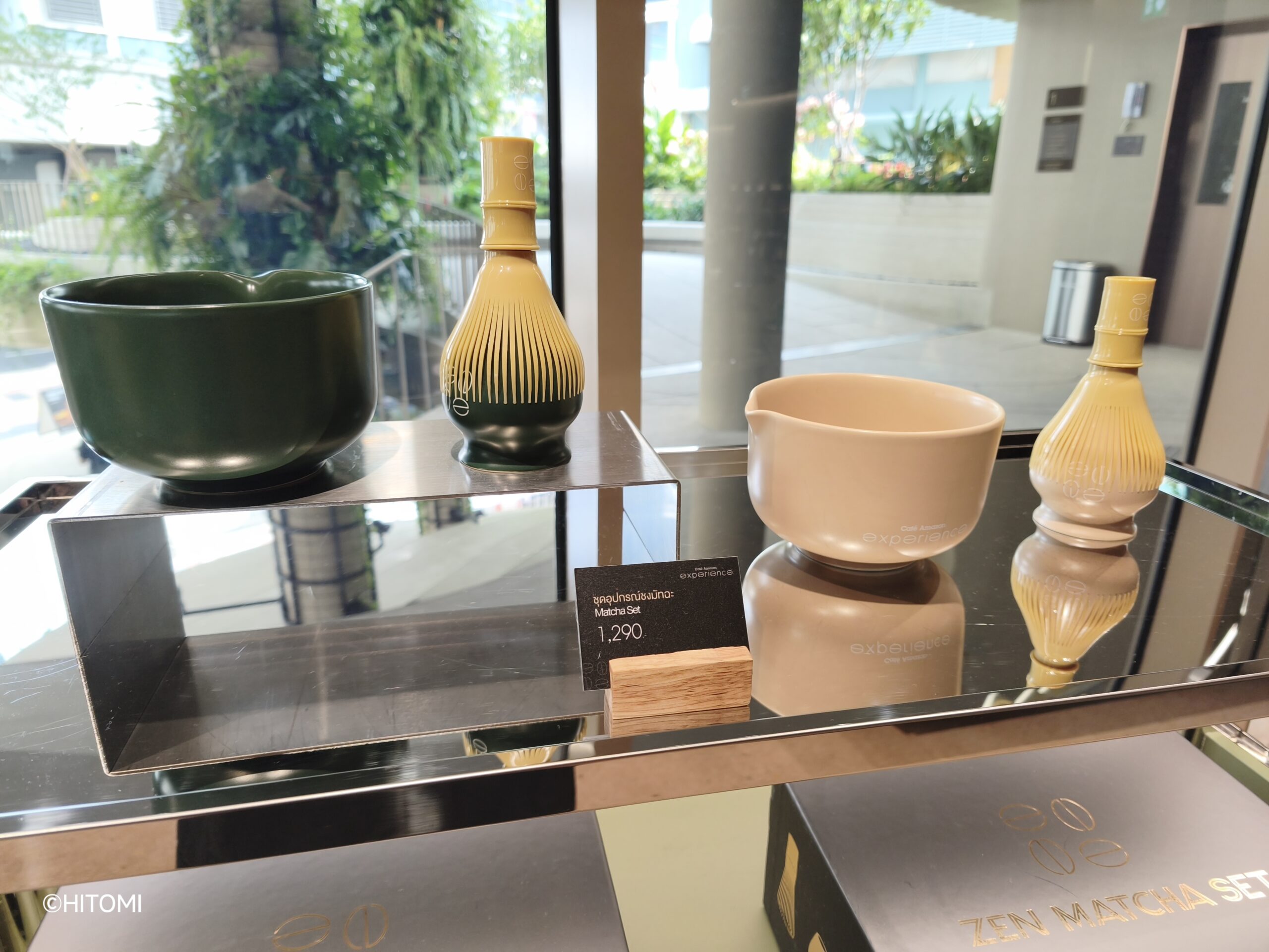 入口付近にはタンブラーなどのグッズをはじめ、コーヒーやお茶関連の商品が並びます。特に目を惹くのは、片口抹茶碗のセット(1,290バーツ)。抹茶は世界的にブームとなっていますが、タイでも2023年頃から抹茶ドリンクが流行しており、本格的にお茶を点てて楽しむ人も増えているそうです。