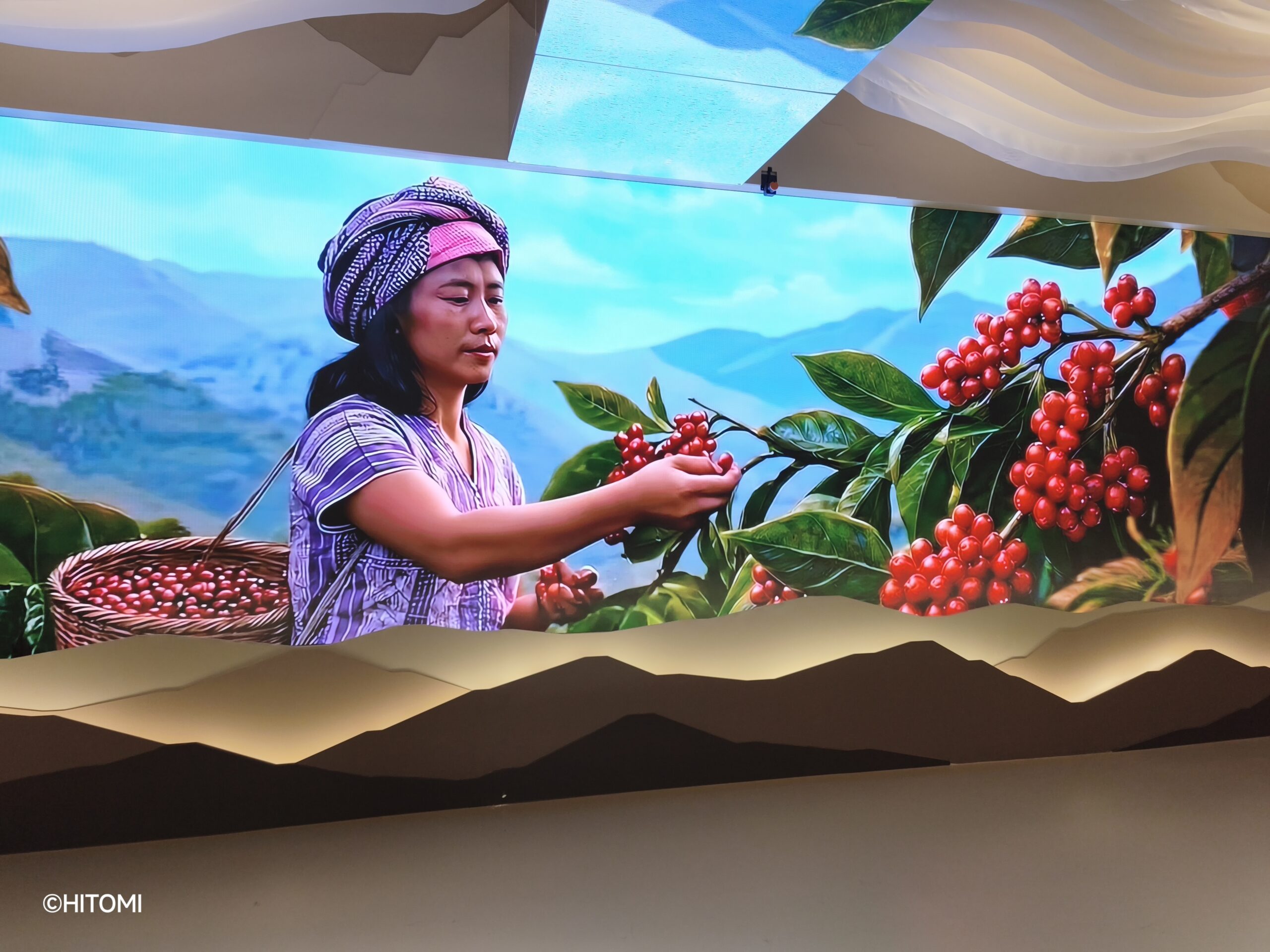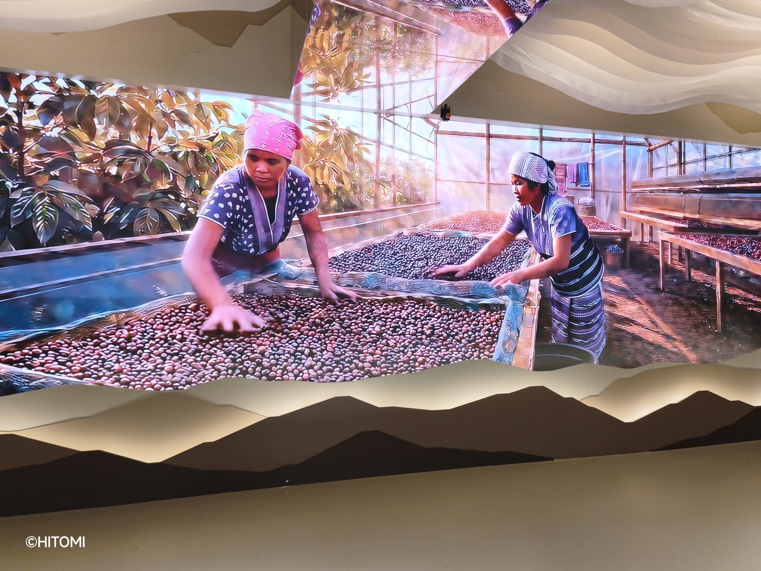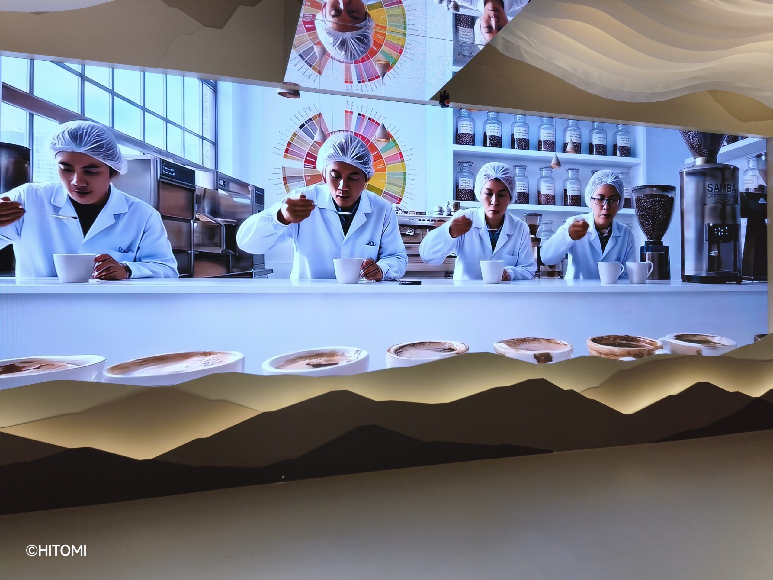 4階には、カフェアマゾンの生産工程を紹介する映像や、受賞トロフィーなどが展示されています。