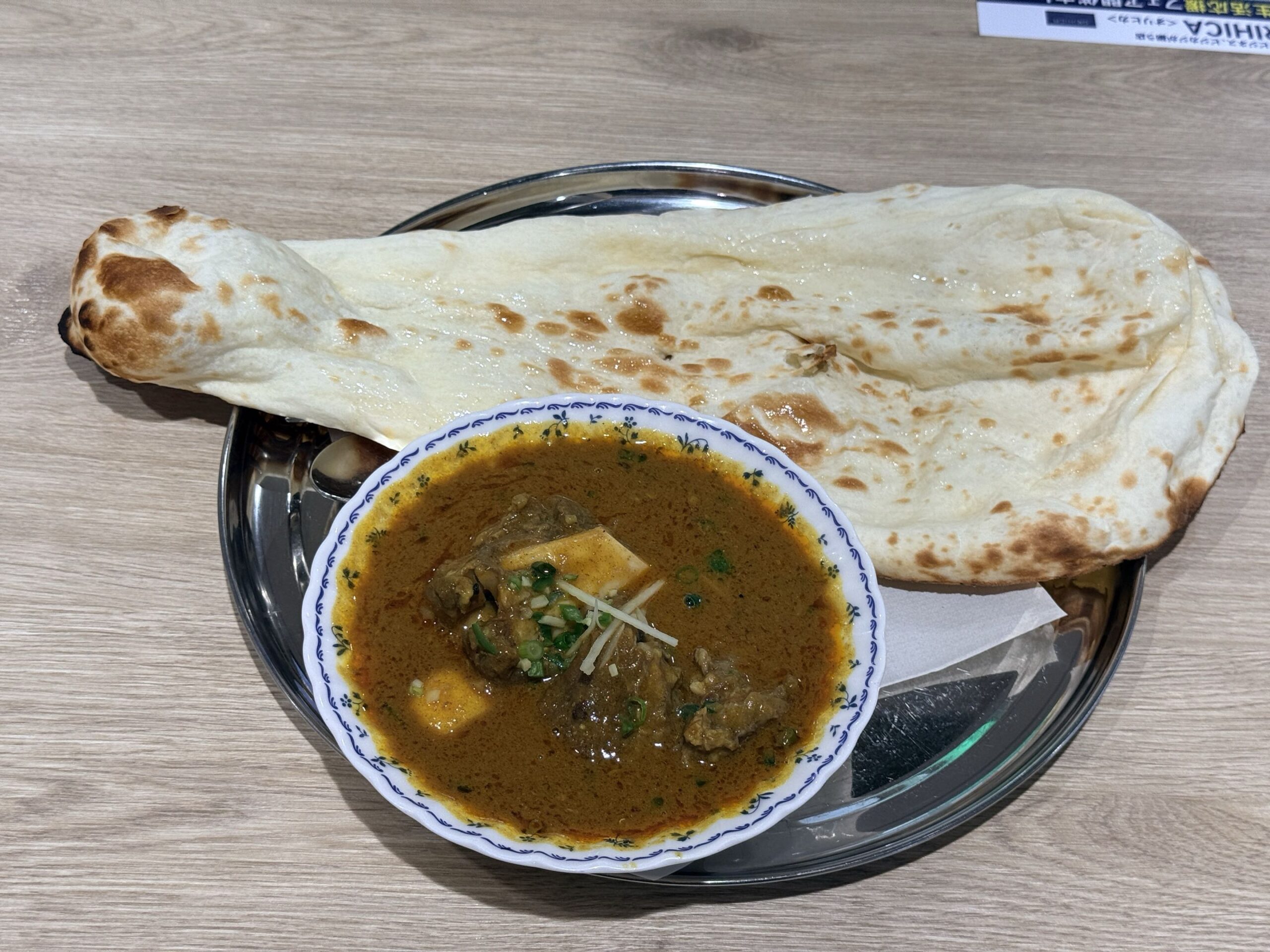 丸い銀皿の上にナンとラムニハリが載ったシンプルな構成ですが、骨付きラム肉がじっくりと煮込まれたニハリからは野趣に富んだ肉とスパイスの香りが漂ってきて食欲をそそります。