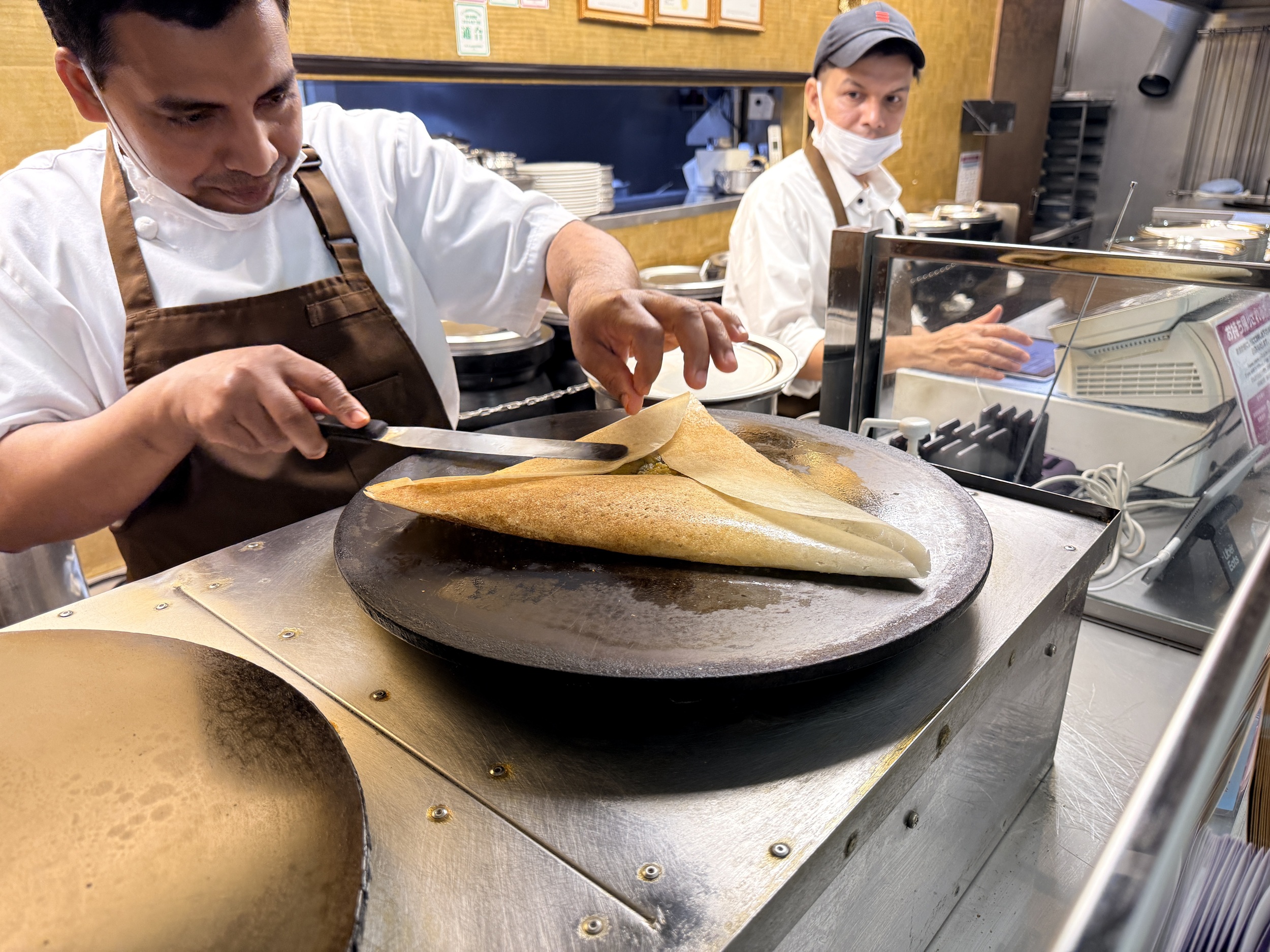 南インドを代表する料理である「ドーサ」は、米と豆の生地を発酵させて薄く焼き上げたもの。これをくるんとロールしてあるのがプレーンドーサの特徴。中にはマサラを混ぜてマッシュしたじゃがいもが入っています。