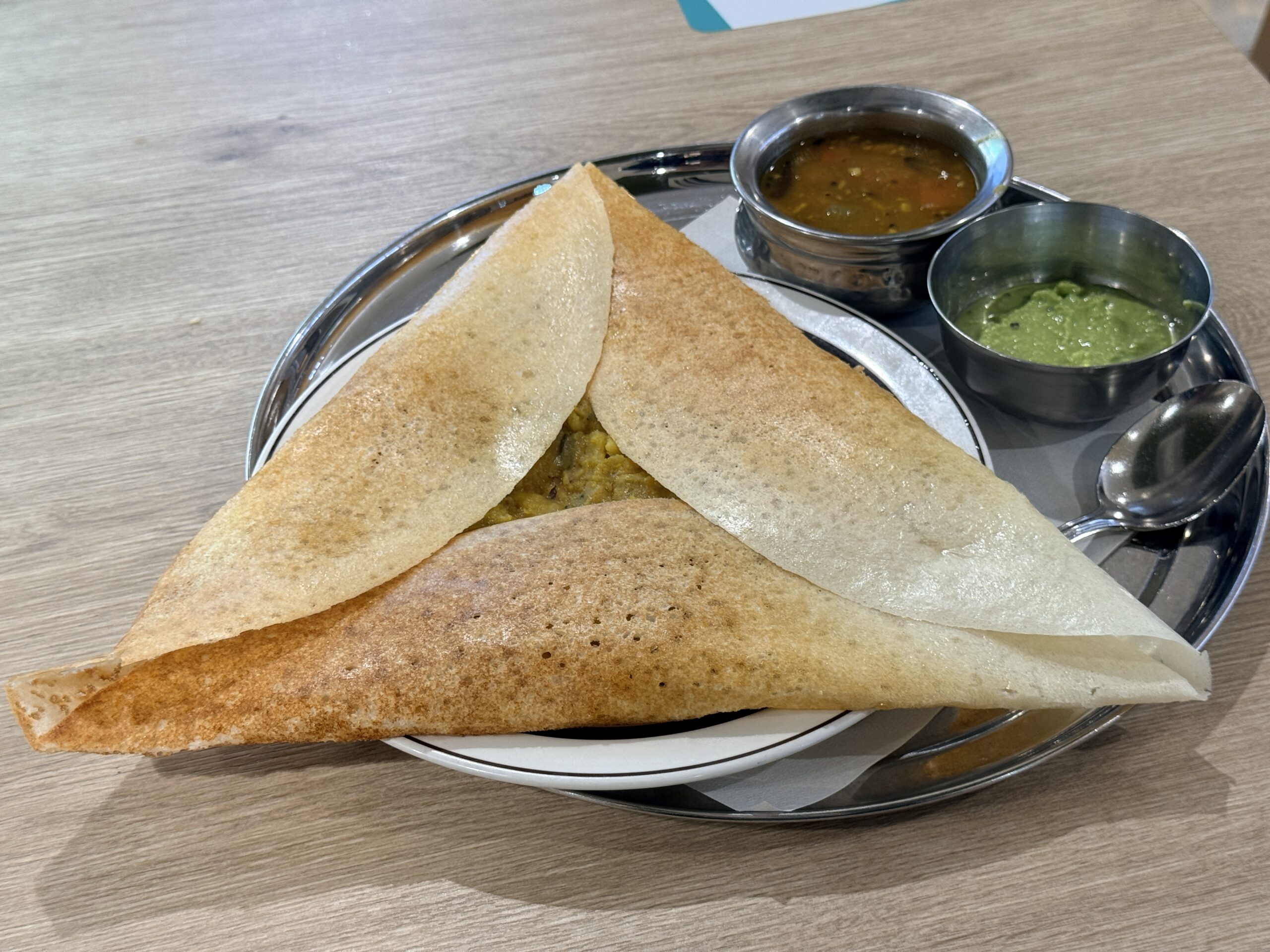 「マサラドーサ」は、プレーンドーサと違って生地のなかにたっぷりとポテトや野菜が入っている料理。フランスのガレットに似たような包み方をしています。こちらにもサンバールとグリーンチャトニーが付いていて、一緒に食べると満足感が上がります。