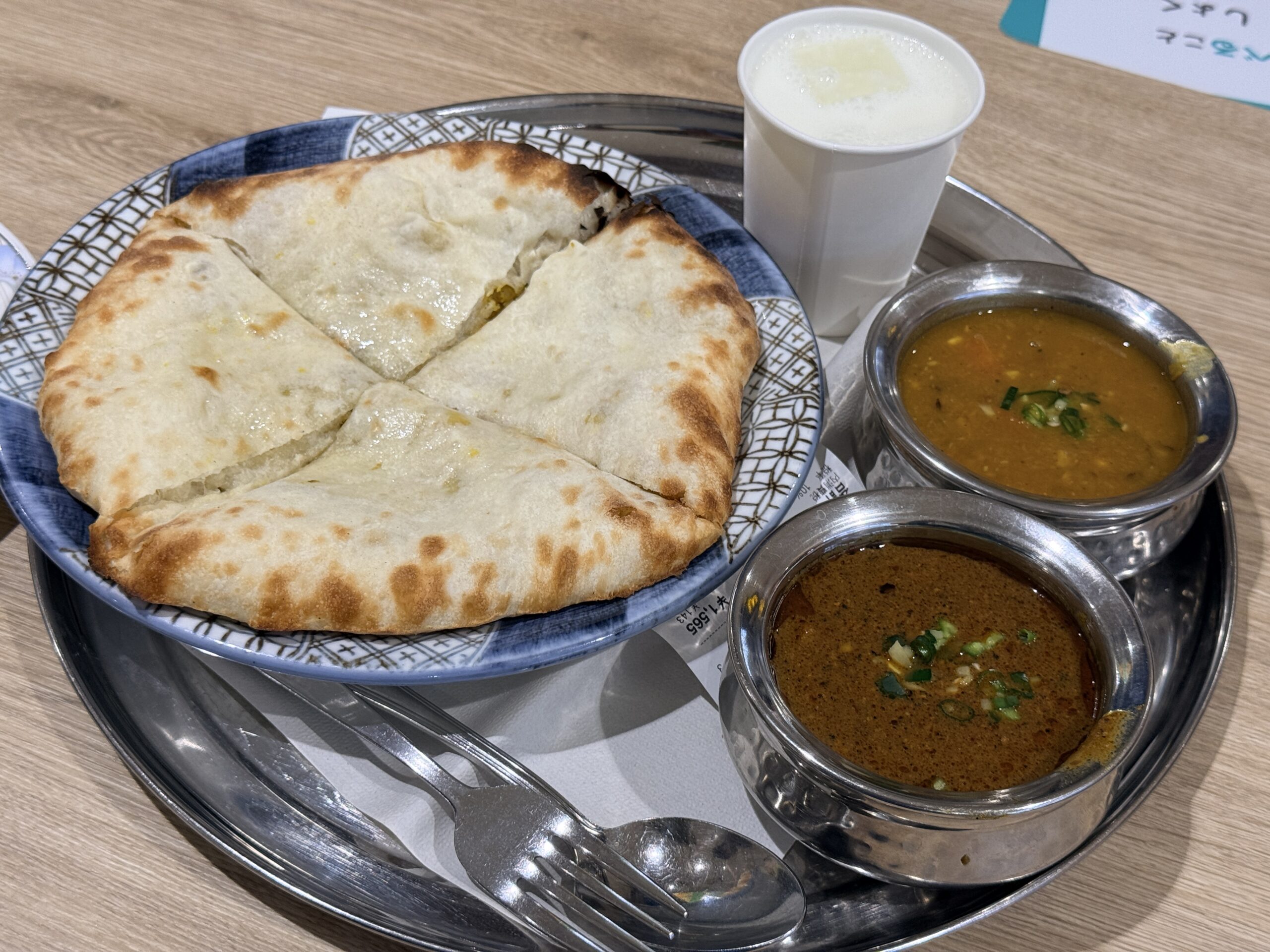 こちらは「マサラパラタと2種類のカレーセット」。ドリンクはラッシー。カレーは南インドサンバールと、南インドチキンカレーを選びました。