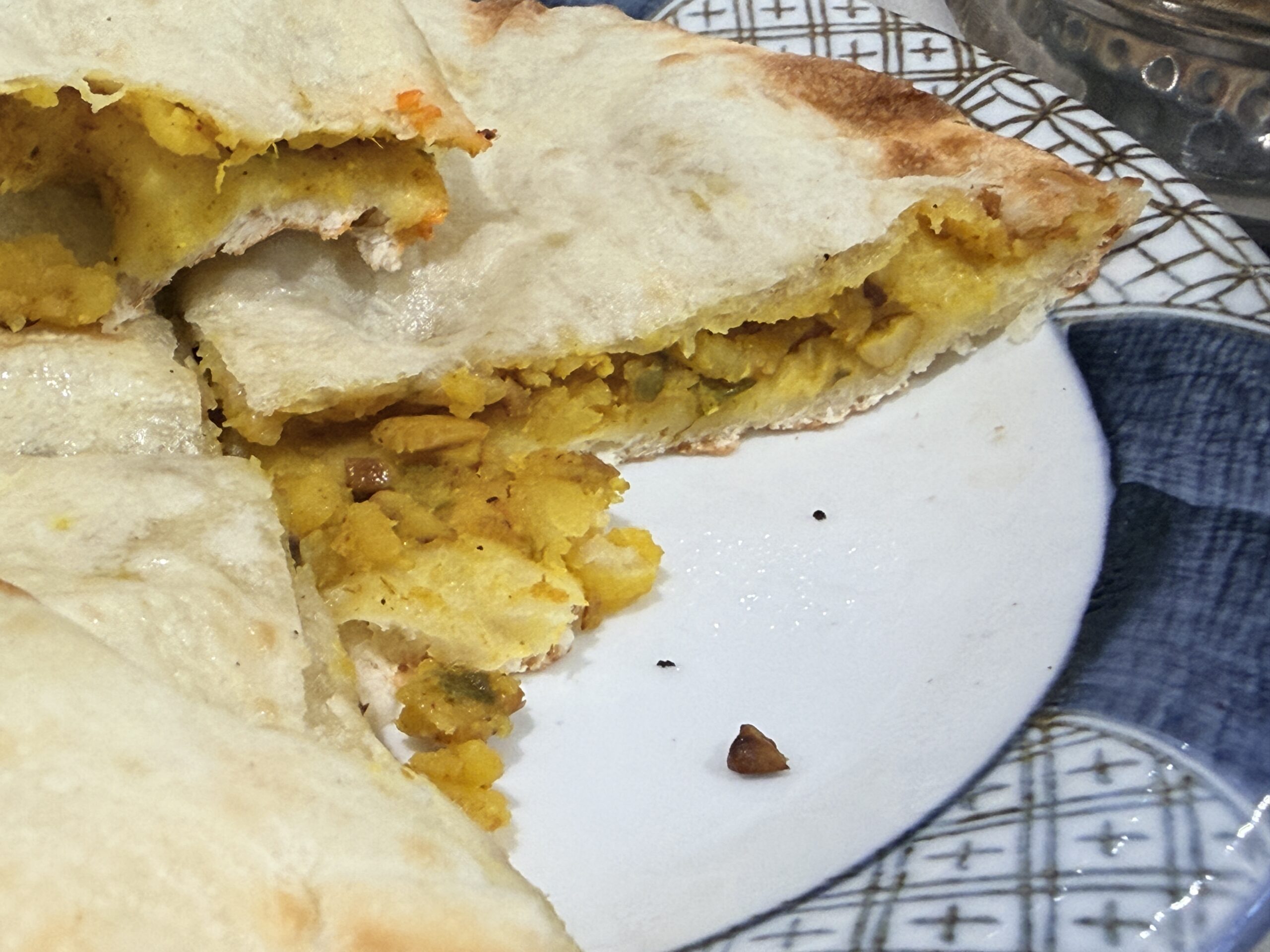 マサラパラタはスパイシーなミックス野菜ペーストが平パンのなかに入っているもの。じゃがいも多めなので、見た目よりも腹溜まりの良くボリューミーです。