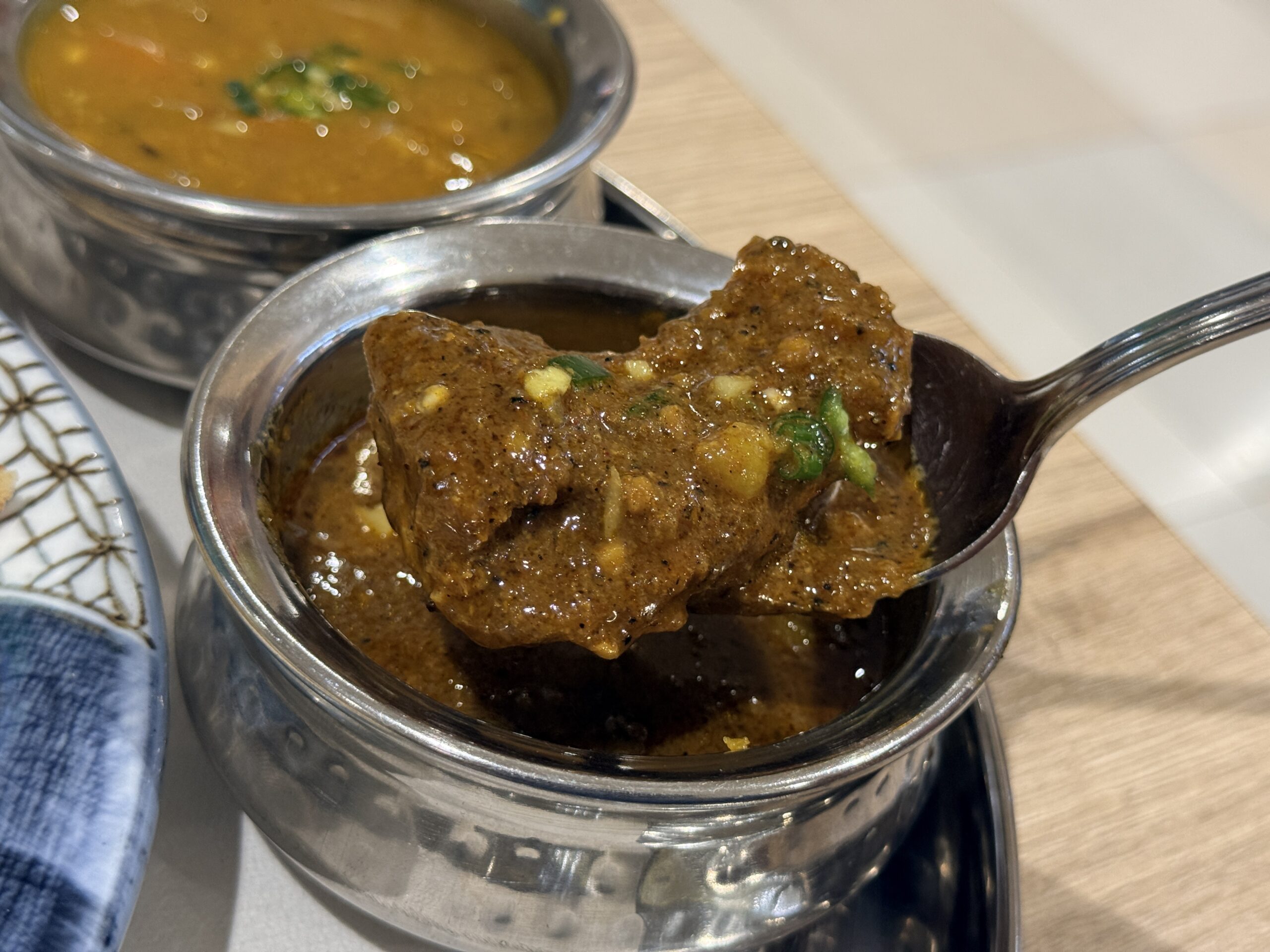 骨付きのラム肉はほろほろになっていて、スプーンでするっとほぐせるくらい。それを熱々でもっちりとしたナンと食べると最高です。