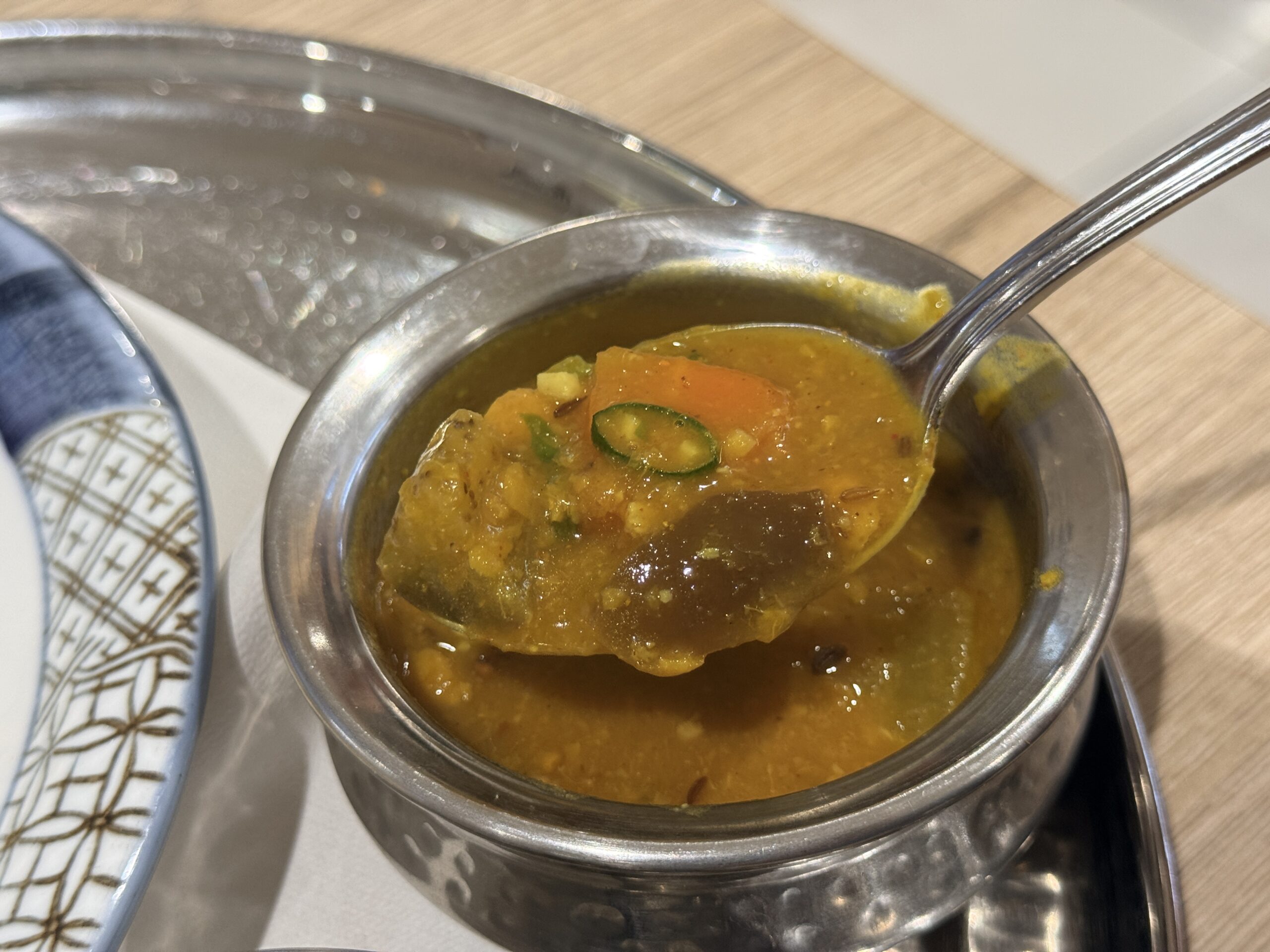 サンバールは南インドの野菜スープで、トゥール・ダルという豆とナスなどの野菜が煮込まれていて、これまたスパイシーな味わいです。