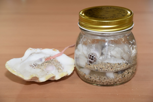 この貝殻は、すべて粟国の海岸で集めたもの。希望すれば自ら海岸で好きな材料を集めることもできます。熱したジェルを注ぎ、しばらく置けば完成です。粟国島の美しい海の思い出をギュッと濃縮したような小瓶。いざ、キャンドルを使うシーンが訪れても、もったいなくて火が点けられないかもしれません。