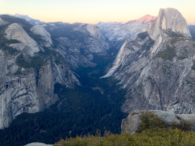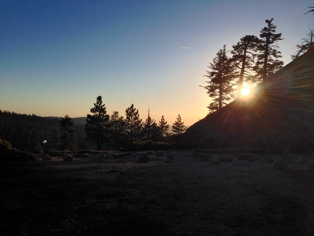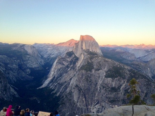 岩場を少し降りてきたらちょうど夕日が山の中に沈んでき始め、慌ててヨセミテの名所グレーシャーポイントに向かった。この日の日没は夕方7時頃との事。急げ!!