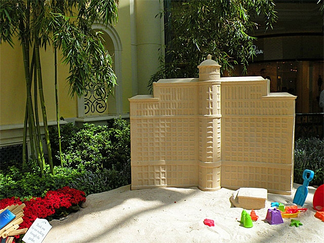 桟橋横のビーチには砂で作られたベラージオホテル、高さ1.5mの砂の城。さすが芸が細かいです。