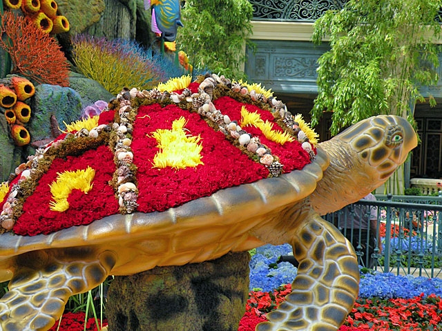 カメの甲羅、貝殻の縁取りに赤いカーネーションと黄色いキクの花で覆われているのがわかりますか?