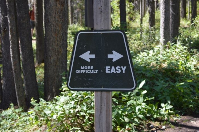 グラッシーレイクを見るためには駐車場からハイキングをしなければなりません。200m位歩くと道が2つに分かれます。簡単な道か難しい道か選択を迫られます…。